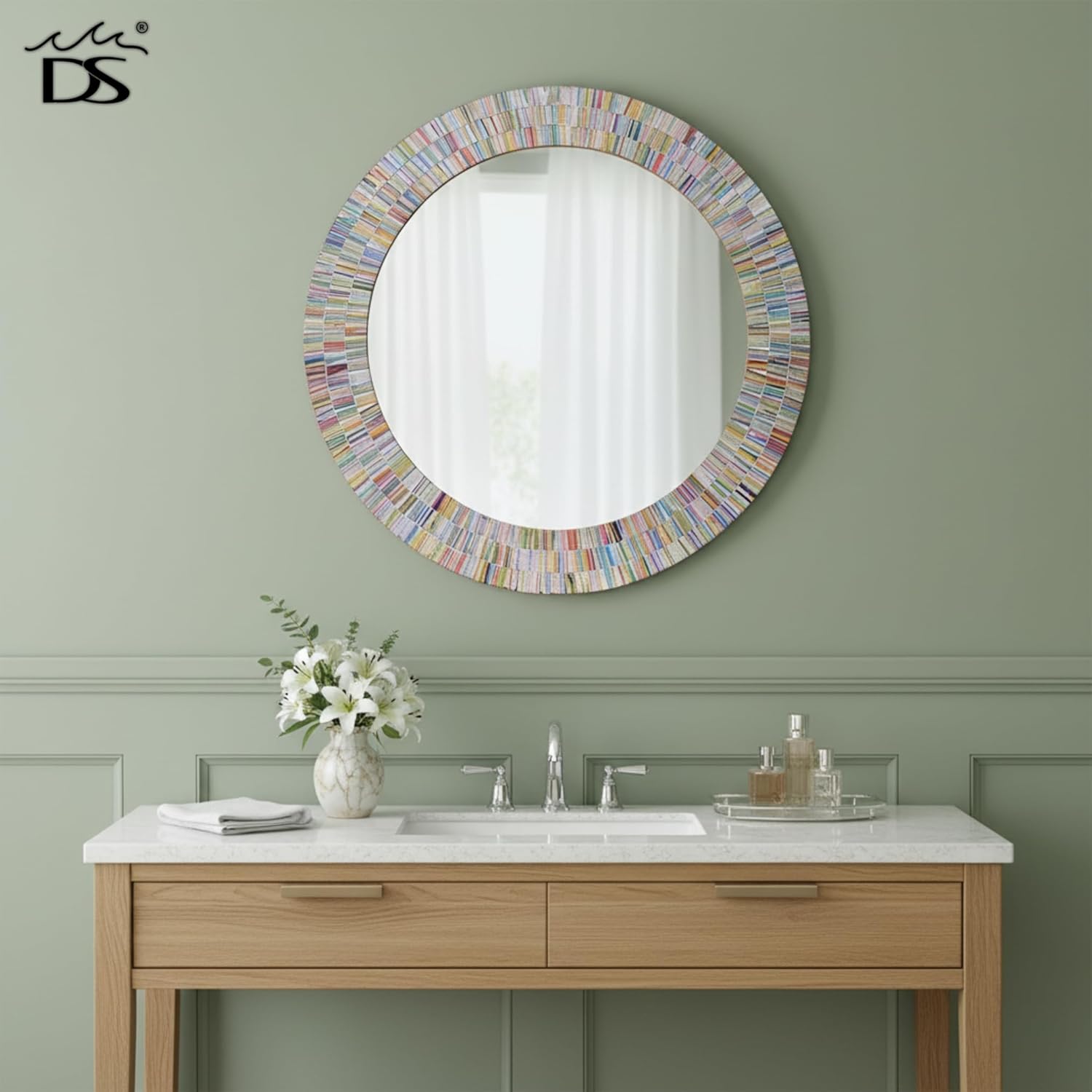- 24" Round Decorative Wall Mosaic Mirror with Rainbow Colored Mosaic Glass Tile Frame