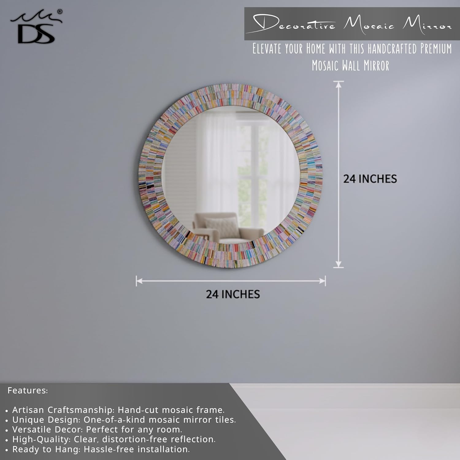 - When choosing this item, keep in mind lighting and placement. The surface is very reflective. If your lighting is warm or cool toned, the mirror tends to absorb the hues. Likewise, if you place the mirror across from a wall with color, or natural light source, the mosaic frame will reflect the color or light. Each Piece of Handmade Home Decor is One-of-a-Kind, & Available for a Limited Time.