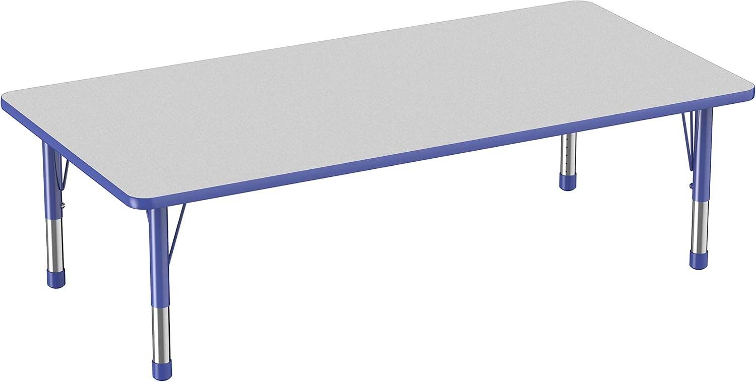 FDP Rectangle Activity School and Classroom Kids Table (36 x 72 inch), Toddler Legs, Adjustable Height 15-24 inches - Gray Top and Blue Edge