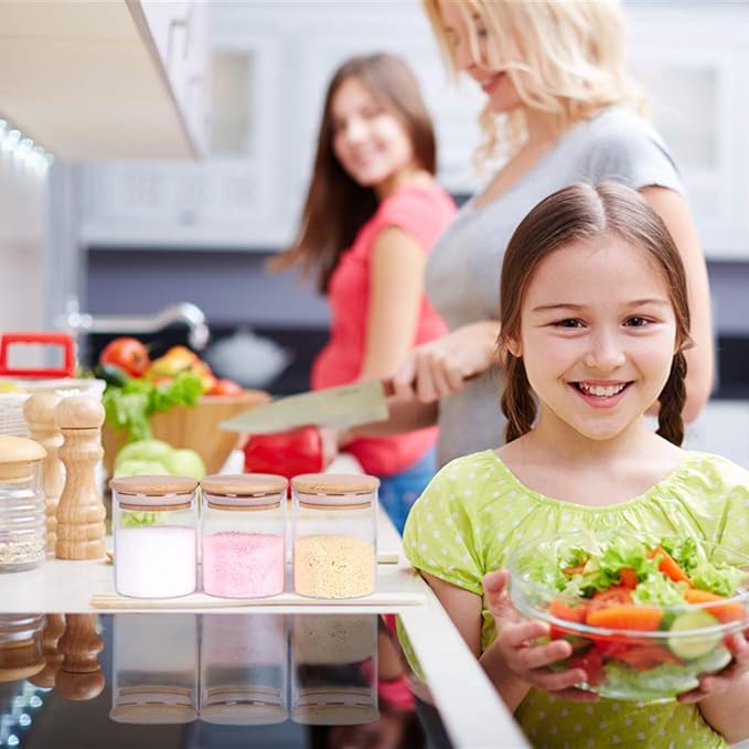 - 【DURABLE】These cute glass containers are thicker than other jars.There is a silicone ring on the bamboo lid that will not make a sound and scratch the jar when the lid is opened.I think the wooden lid is more environmentally friendly and healthy.