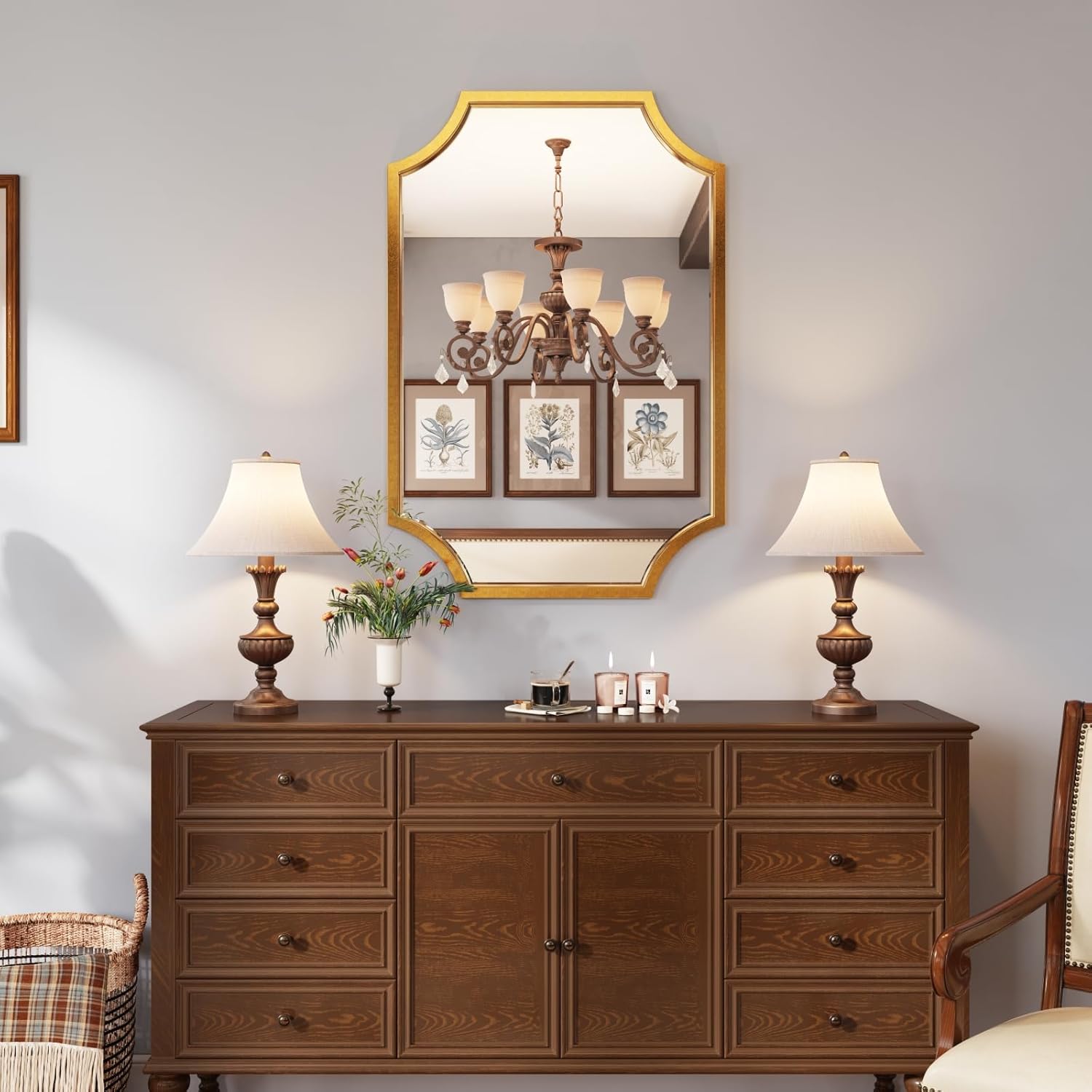 - SOPHISTICATED DESIGN: The mirror frame features an elegant scalloped corner shape. It's a traditional mirror style, but it also gives the mirror a simple and modern look, and it can be placed over a cabinet or fireplace or hung in your bathroom, living room, dinning room, or kitchen.