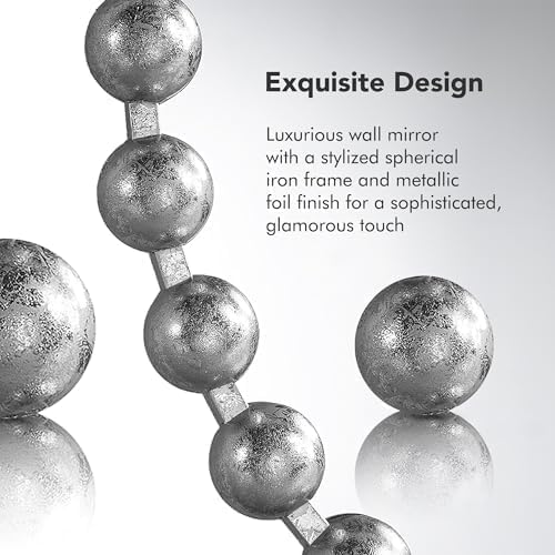 - This round mirror features a stylized spherical iron frame finished with metallic foil, creating a bold and glamorous allure