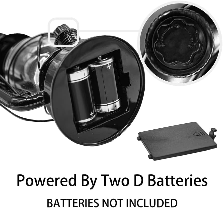 - BATTERY OPERATED: Each vintage lanterns battery powered led by 2 D batteries (not included), the battery life varies based on usage. Without wiring limited.This lantern is great useful for camping when you make your way around the campsite and your tent easily in the dark. Please note when in extreme weather conditions, the lamp should be placed indoors to prevent glass from breaking.