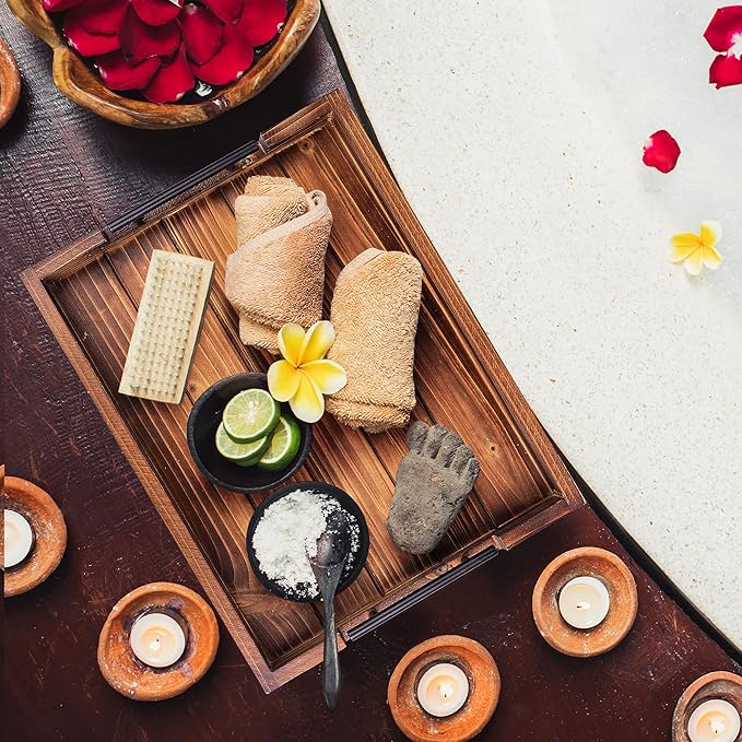 - INCLUDED WOODEN COASTERS SET OF 4 β Along with our wooden serving trays, we also provide a set of 4 natural wooden coasters that have a tasteful torched appearance. These wooden coasters for drinks are the best way to protect your tables from spills, mess, and stains while also adding a decorative element to your home, uplifting the overall aesthetic appeal β MUST HAVE ottoman tray with handles can be used as a Drink Tray!