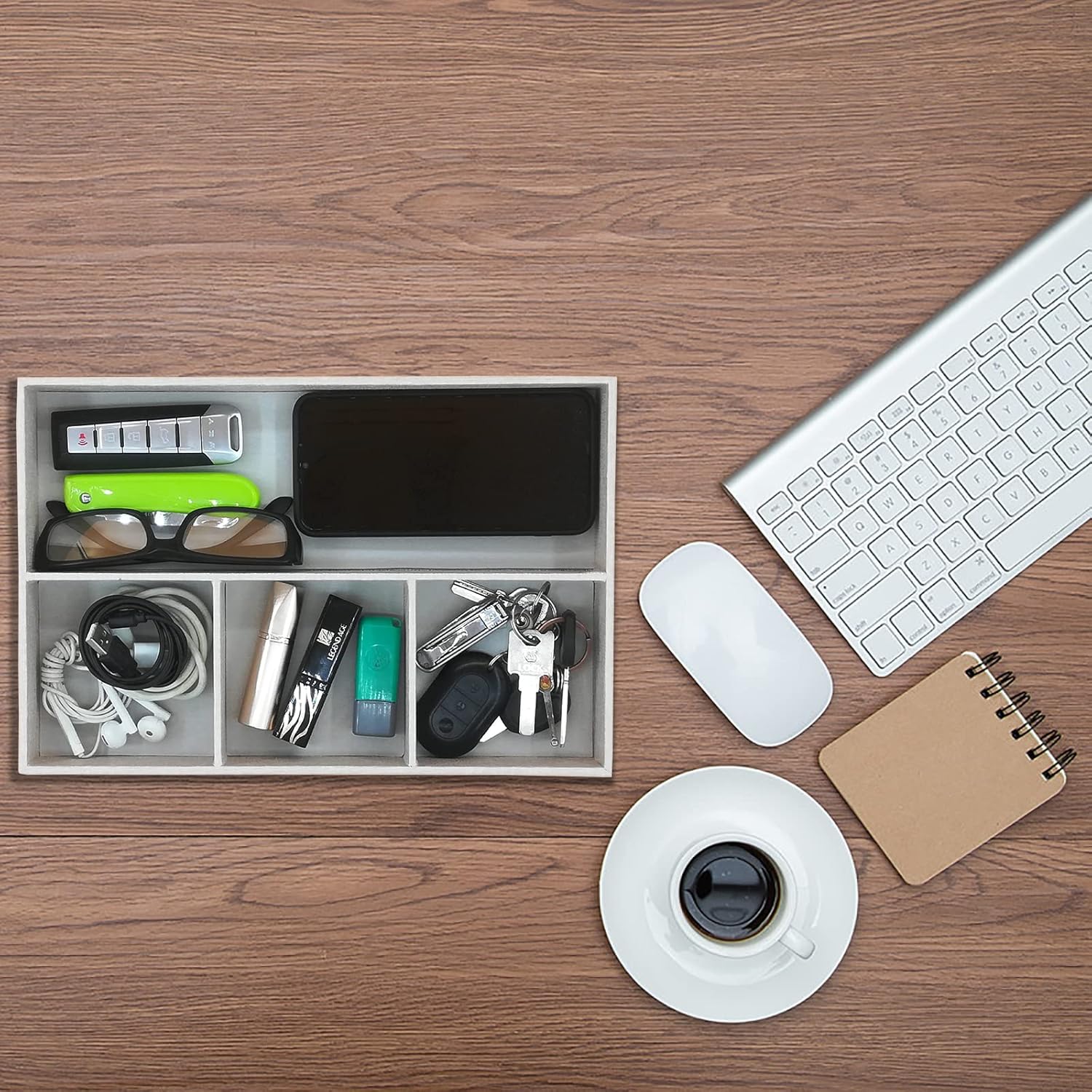 - [Storage tray] This 4-compartment tray can store mobile phones, watches, glasses, money, wallets, coins, keys, jewelry, etc., suitable for bedrooms, offices, halls, dressing tables, bedside tables, desktops, etc.