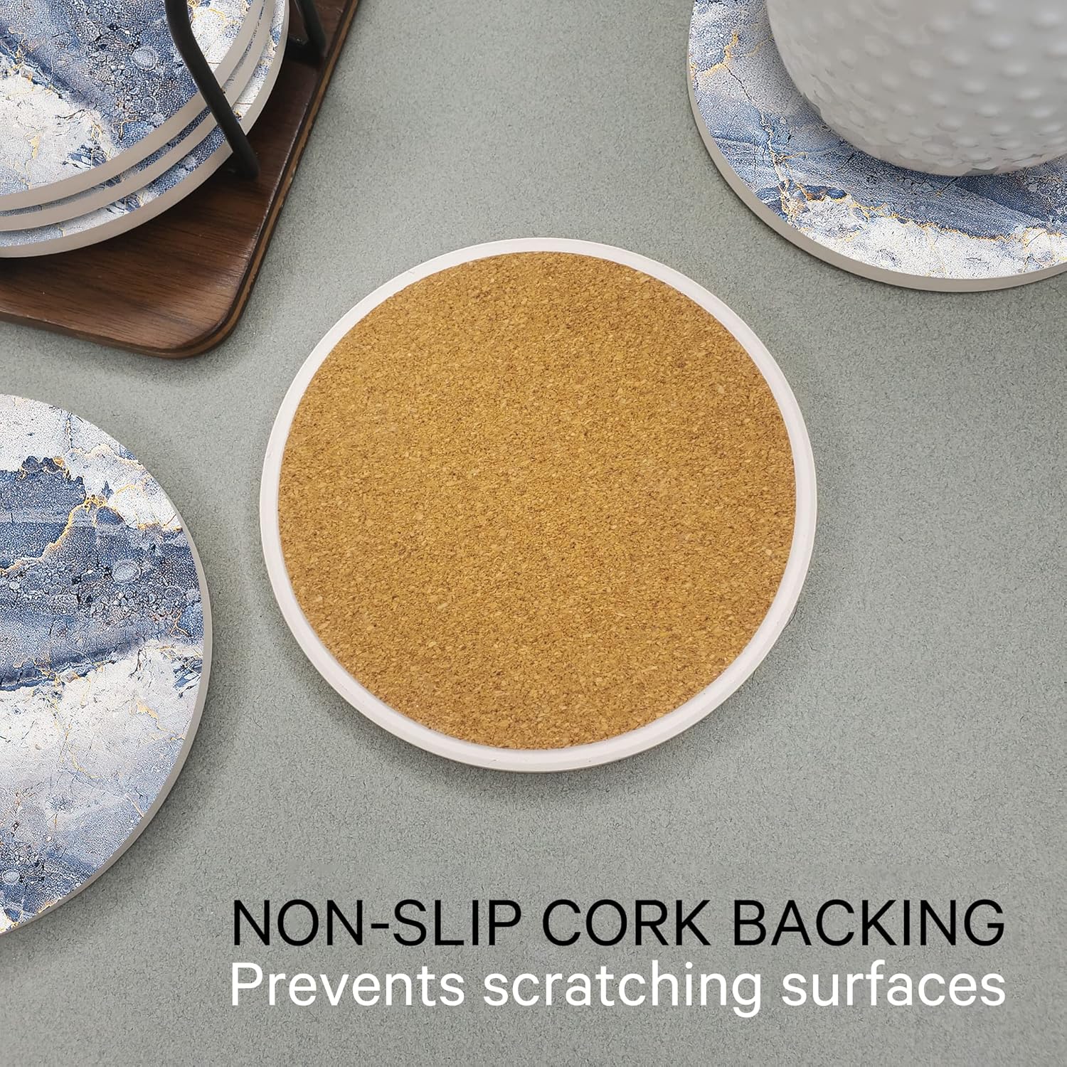 - ✅ CORK BACKING – The decorative coasters come with durable non-slip special absorbant natural cork backing base to protect countertops and slate desks from scratches even from thirsty drinkers! Avoid water damage and dirty stains on kitchen bar tops and wooden desks by hot and cold beverages. Our coasters are stylish, heat resistant and reusable. The non-slide, non-sticky corked backed bottom base helps coasters stay in place and prevent coasters falling off the dining end tables.