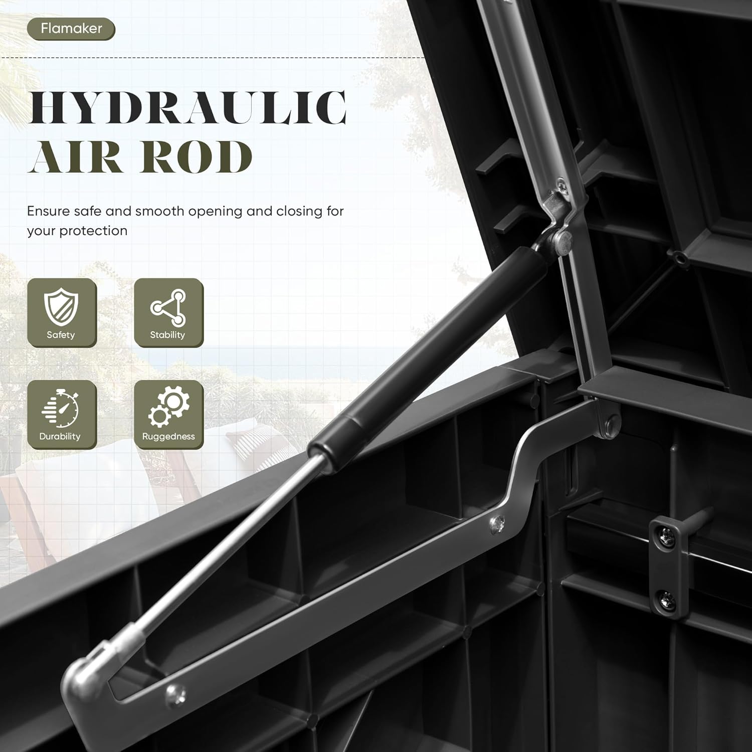 - [Safety Design] The storage box cover and the box are connected by hydraulic rods, which reduces the speed of opening and closing, ensuring the safety, and can be locked to ensure the safety of property