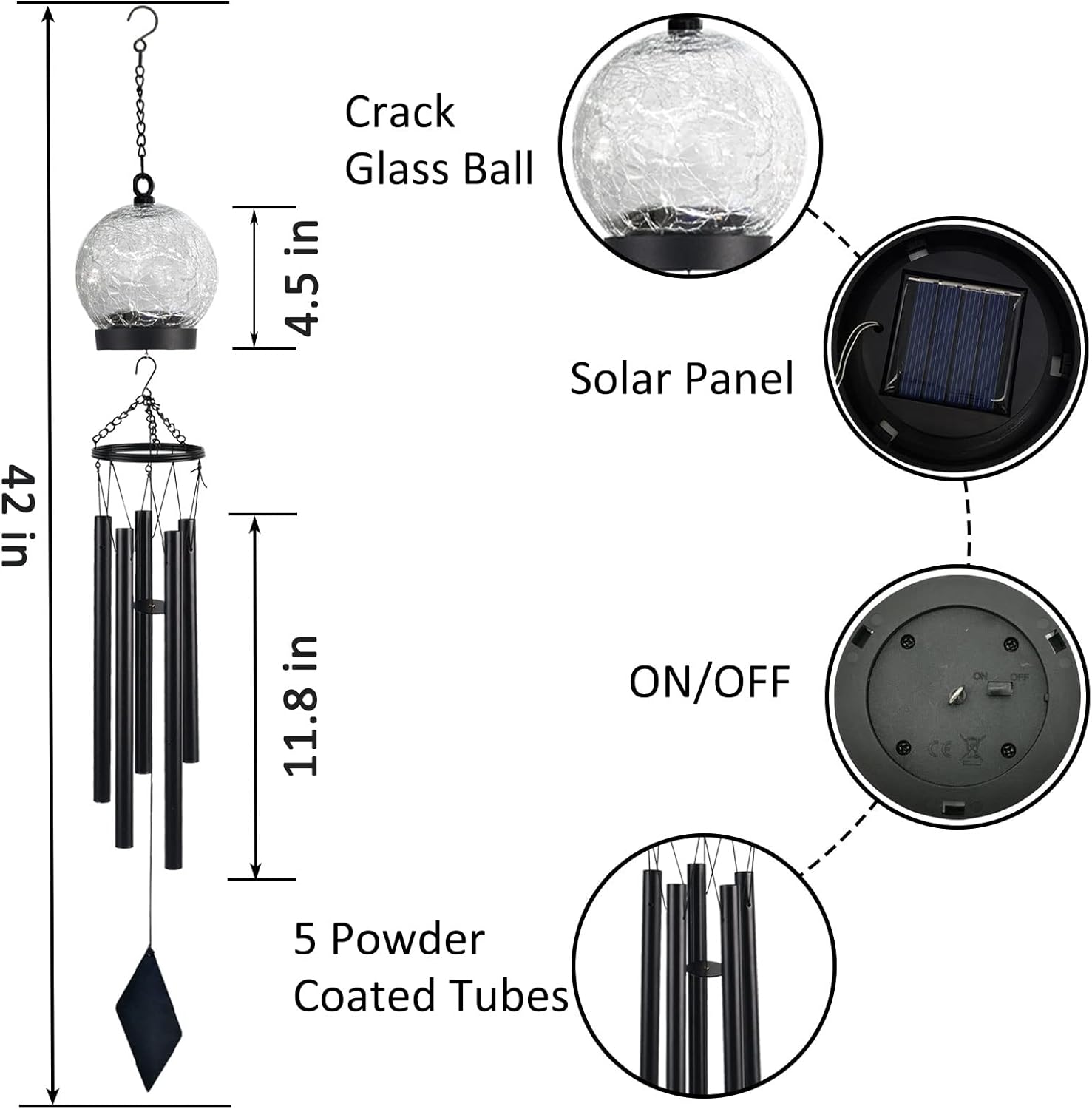 - 【Just The Right Size】: The length of large wind chimes are 42 inches from the top hook to the bottom pendant. The 5 tubes of Windchimes in the center were pinned down from 8.7 inches to 11.8 inches. Prefect garden decor can match different family adornment styles.