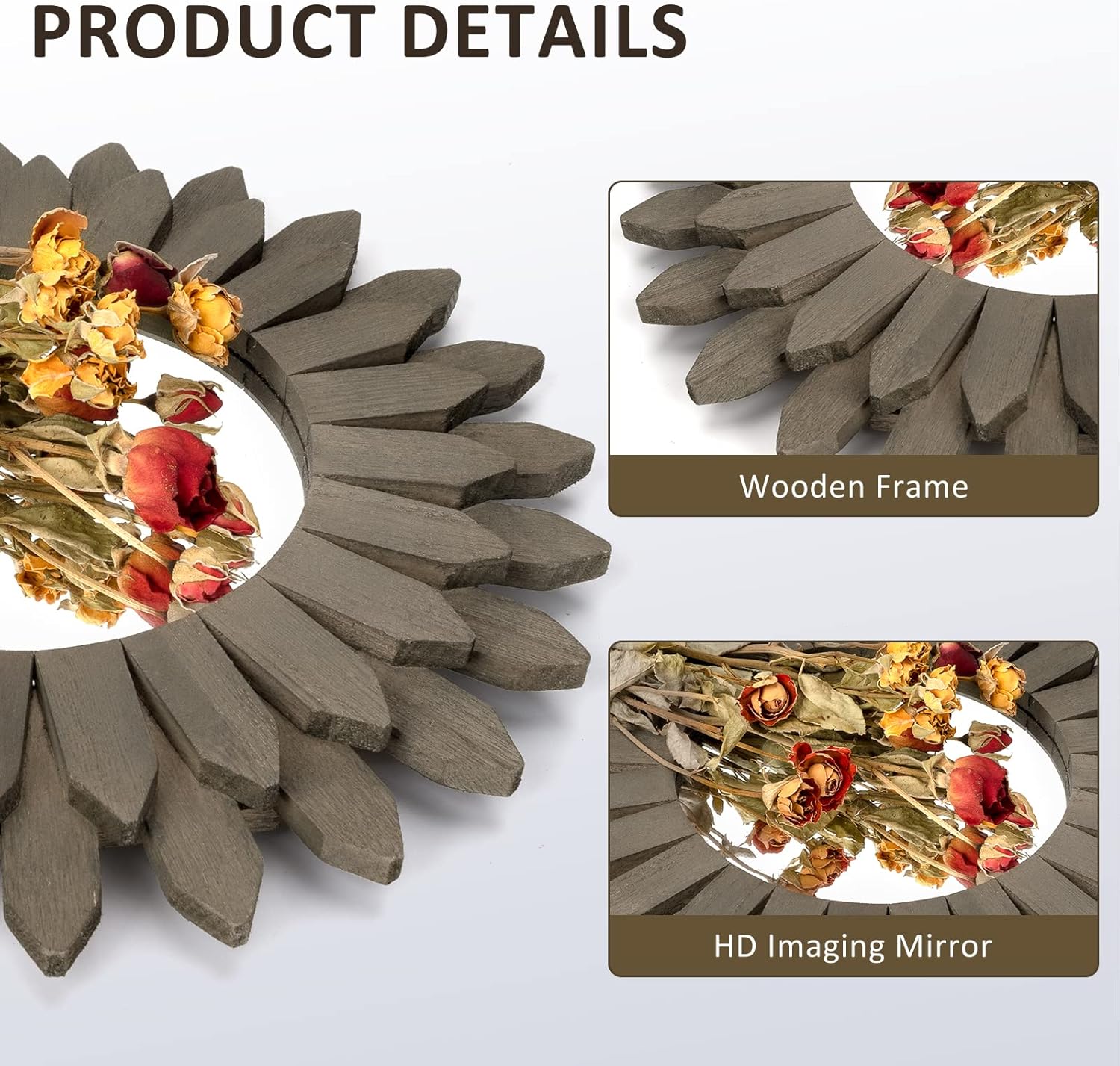 - Boho Wall Decor Mirror: The design of wood sunburst base on the element of boho style, it will be a nice touch and goes well with your others boho decor style; decent decorative piece with perfect size for wall mounted or lean on wall at desk, perfect for your bedroom, living room, bathroom, kitchen and more
