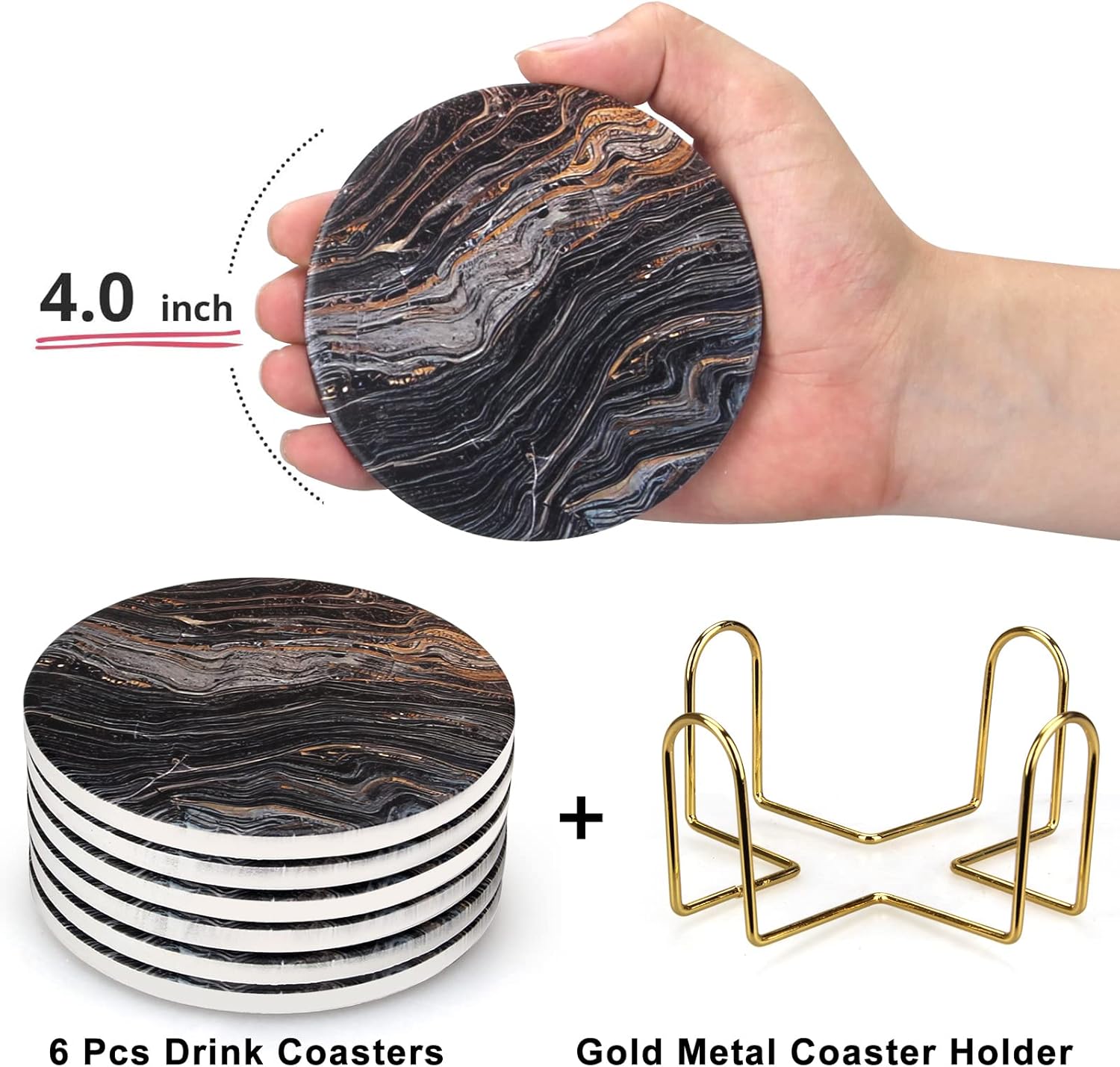 - Convenient for storage: You don't need to bear coasters placed everywhere. Stack nicely in the gold metal holder when not in use and is nicely organized in the metal holder, which will make your home tidier.