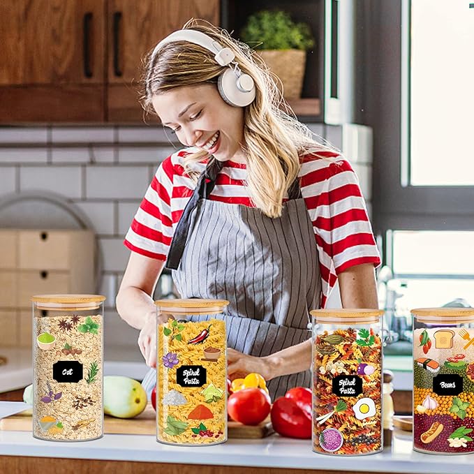 - 【Effortless Organization】Stay perfectly organized with 58 colorful labels included with these kitchen jars. The uniform airtight glass pantry storage containers set with bamboo lids stack neatly to maximize space - ideal for small kitchens storing flour, nuts or pet treats.