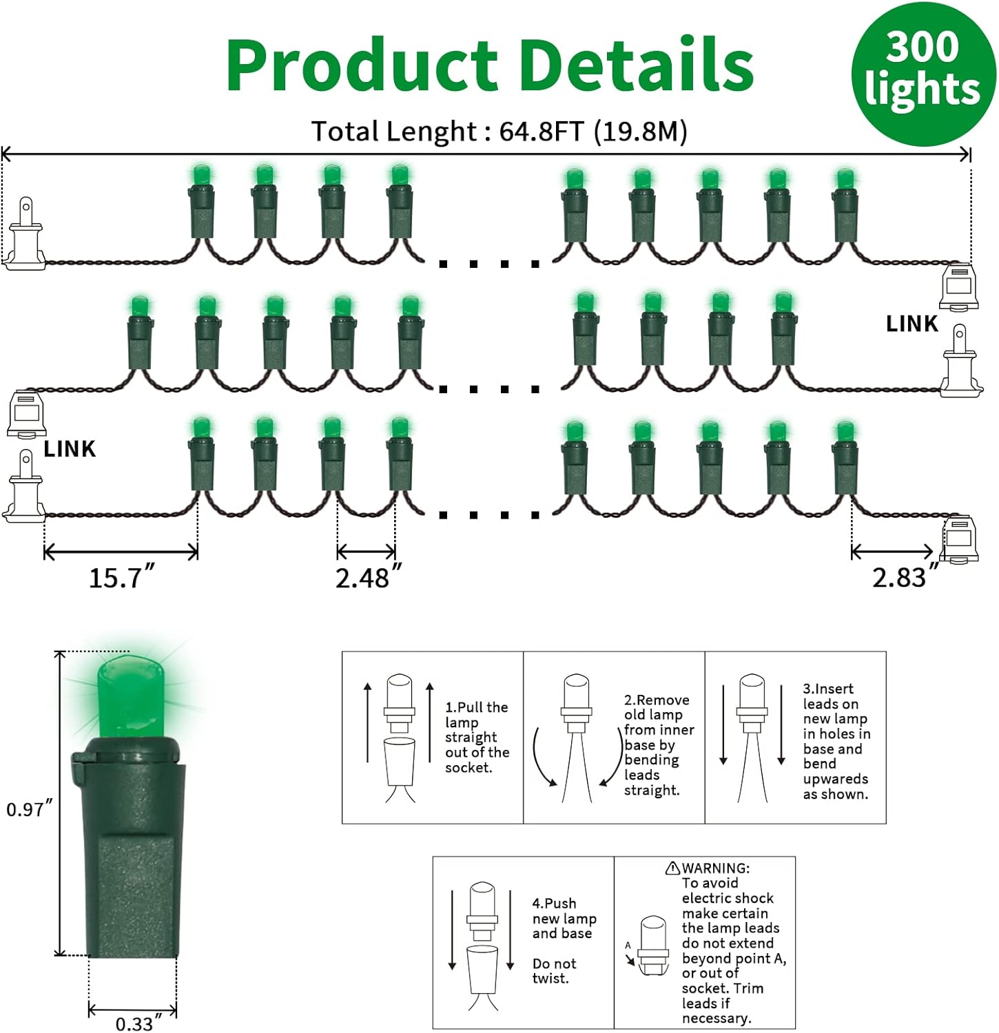 Green Wide Angle LED Christmas Lights, 64.8 Ft 300 Count, Pack of 3 Strands 21.9 Ft 100 Lights UL Certified Commercial Grade Green Wire 5mm Holiday String Light