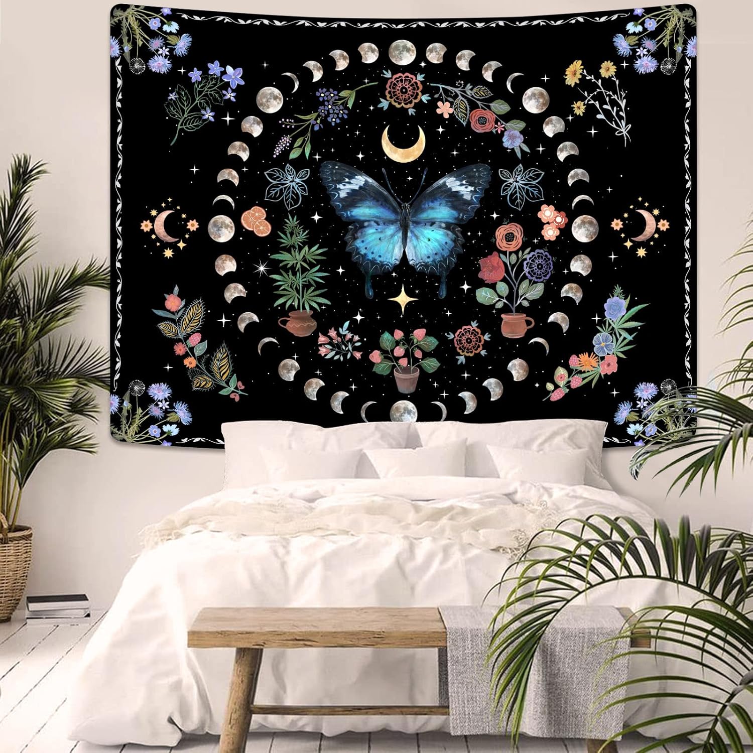 Fowocu Blue Butterfly Moon Flower Tapestry Boho Floral Plant Tapestries for Bedroom Aesthetic Nature Tapastry's Wall Hanging Mandala Botanical Wall Tapestry for Living Room Dorm (Blue, 48'' × 36'')