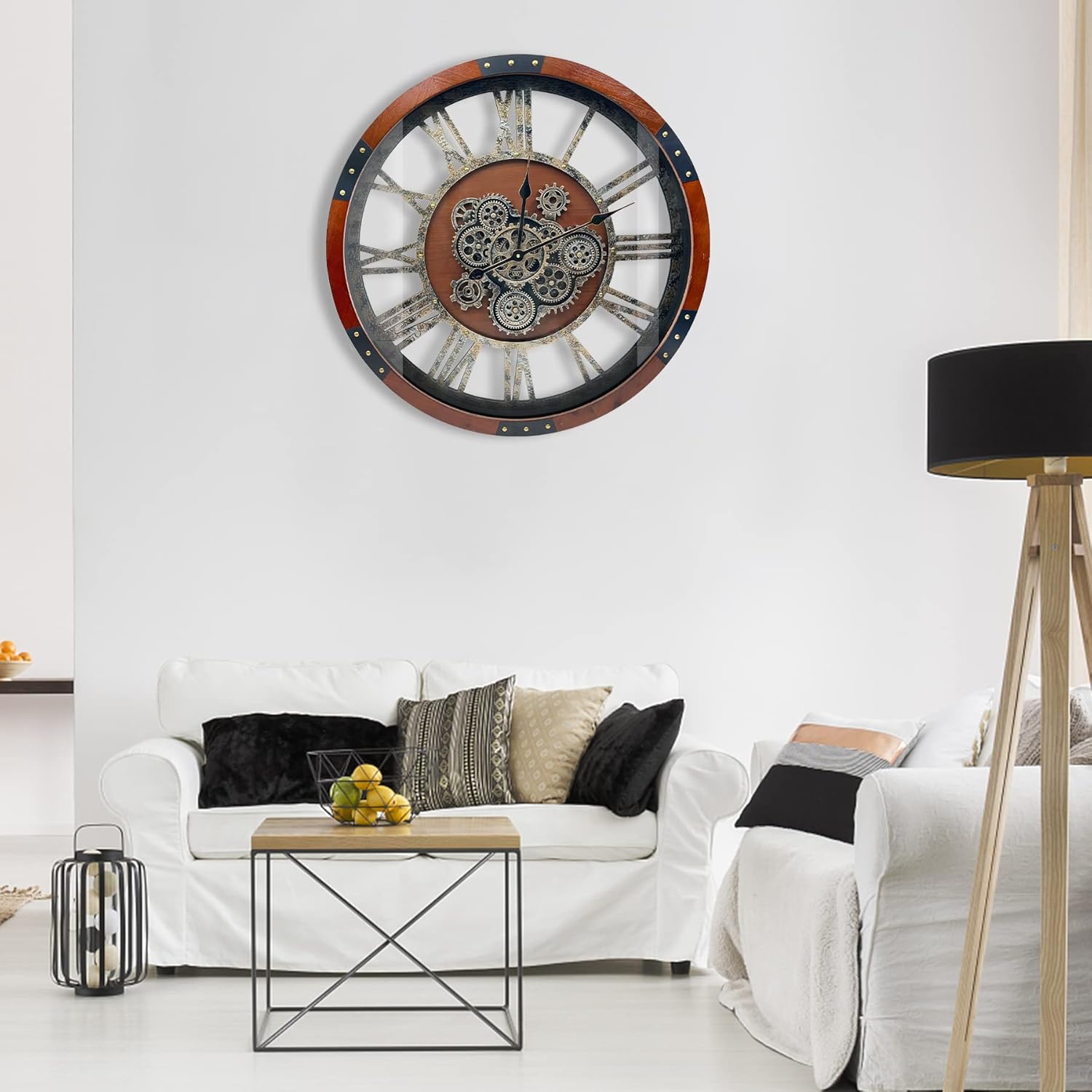 - Unique Design, Only For Your Home: Round solid Wood frame and classic retro metal skeleton with real mechanical moving gears in the central, the wooden frame is handcraft, showing unique attractive wood grain color and small natural knots; rust-imitated treatment marks on the metal skeleton for vintage and industrial effect; stronger tempered glass resists any breakage and keeps safety whenever; The design is very different from other clocks, just to break the ordinary, only for your home