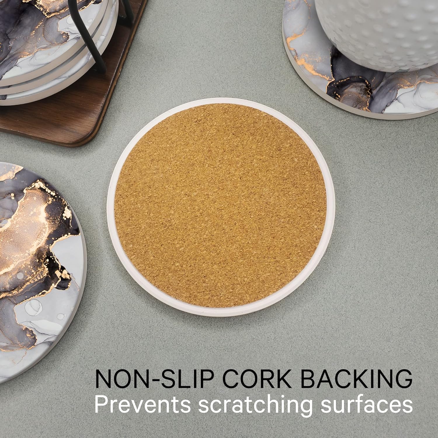 Emerson Coasters for Drinks Absorbent – Saucers Coffee Table Set of 6 with Holder, 100% Ceramic Wooden Tabletop Protection Marble Style, Non-Slip & Cork Bottom - Heavy Duty Drink Coasters (Crown)