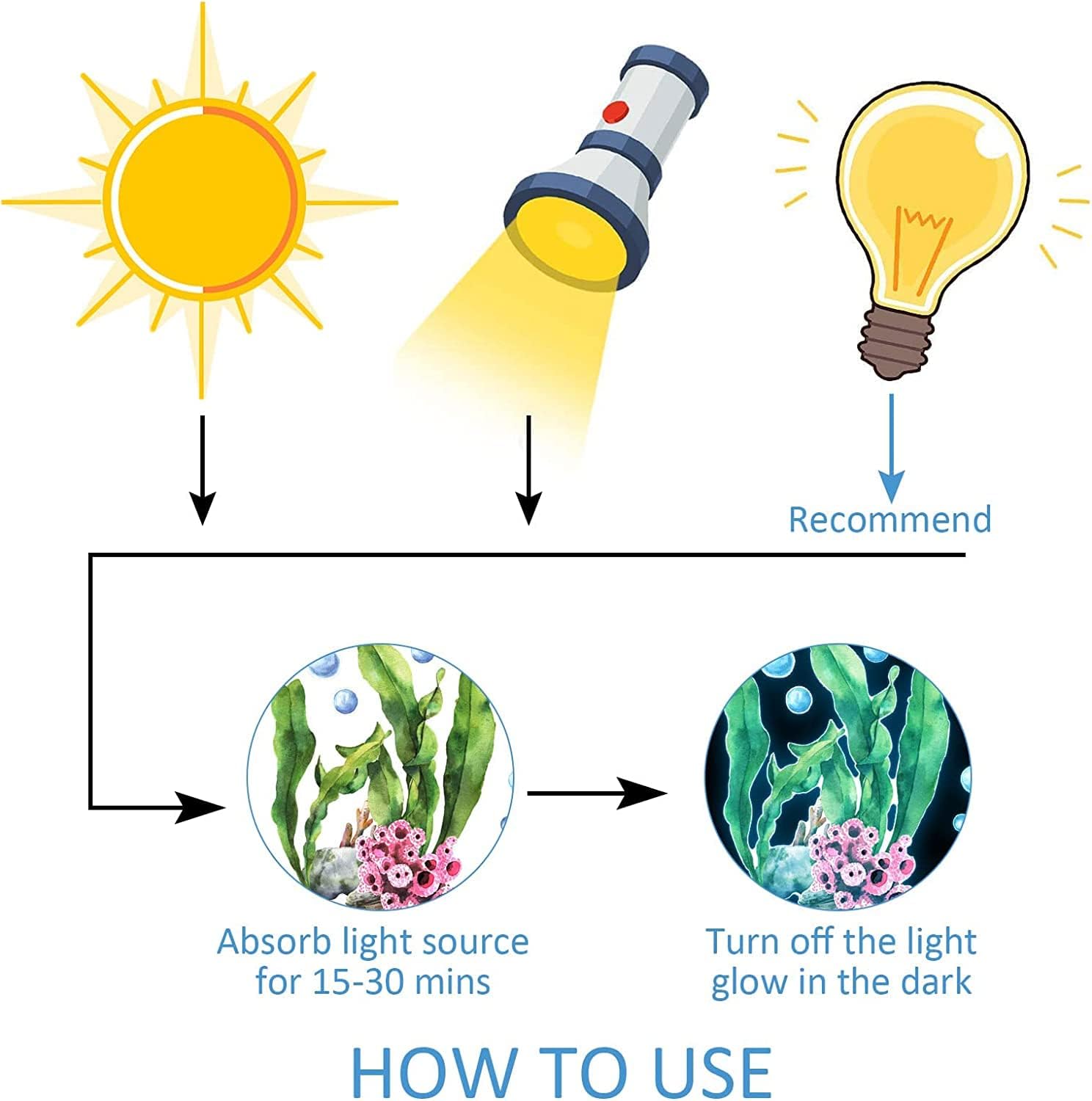 - 🐟【Super Bright and Lasting Glow】Just put it under the light or sunlight for 10-20 minutes before use, and it will glow in the dark for 8-10 hours, making you feel like you are in the underwater animal world. The longer it absorbs light, the longer it stays with you at night. Use a flashlight or cell phone light for better results.