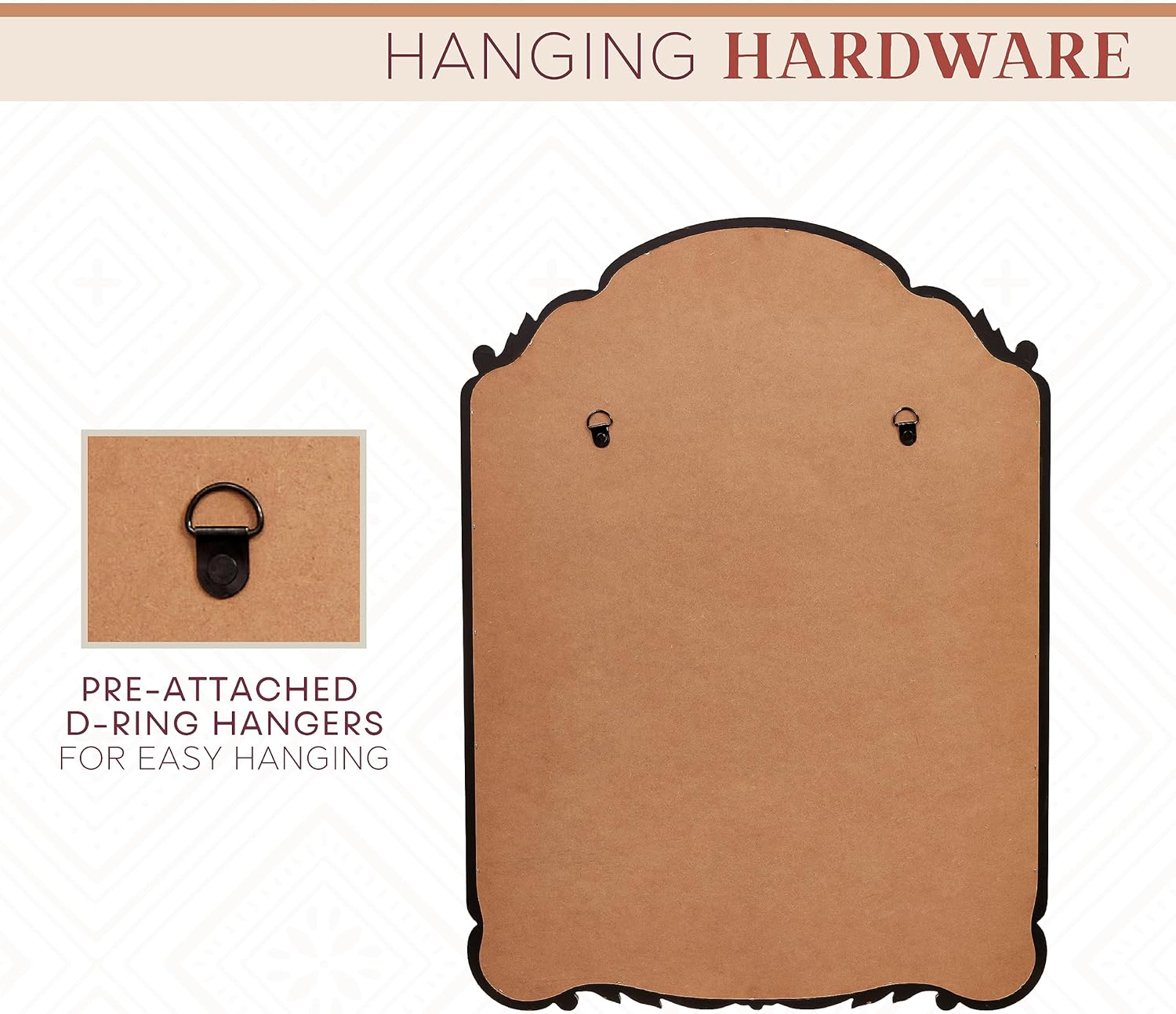 - EASY TO HANG: This mirror includes pre-attached d-ring hangers for vertical wall hanging.