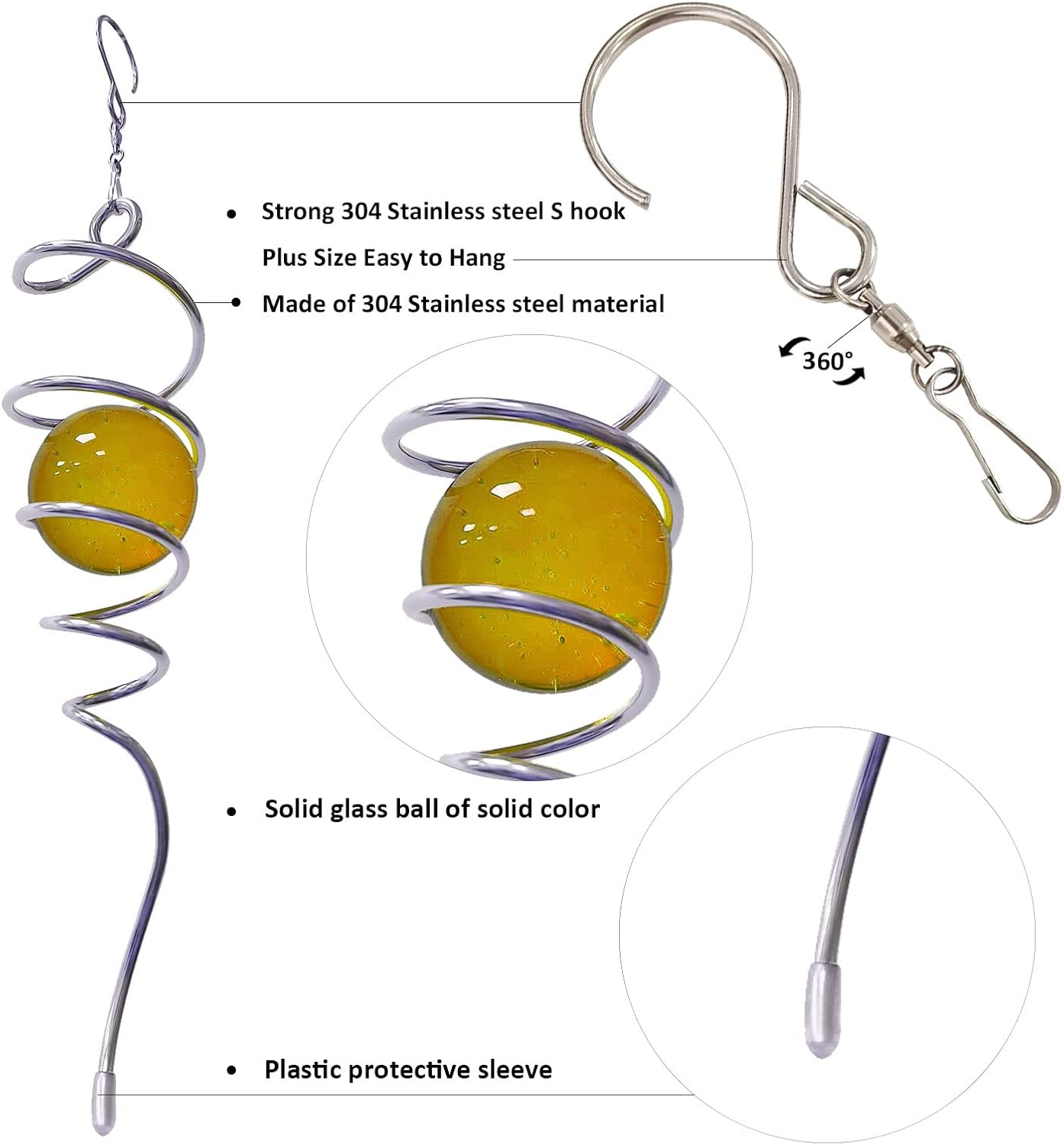 - 【Easy To Position】The wind spinner tail Spiral can't spin by itself ,if you want to make it spin like the video ,need add 1pc motor (not include) ,or combine it with a wind spinner or any rotatable hanging ornament to help it rotate. Come with 1pc 2 inch colored glass orb(not paint), 1pc silver color spiral tail twister,and 1pc swivel hook accessory, ready to hang and enjoy.