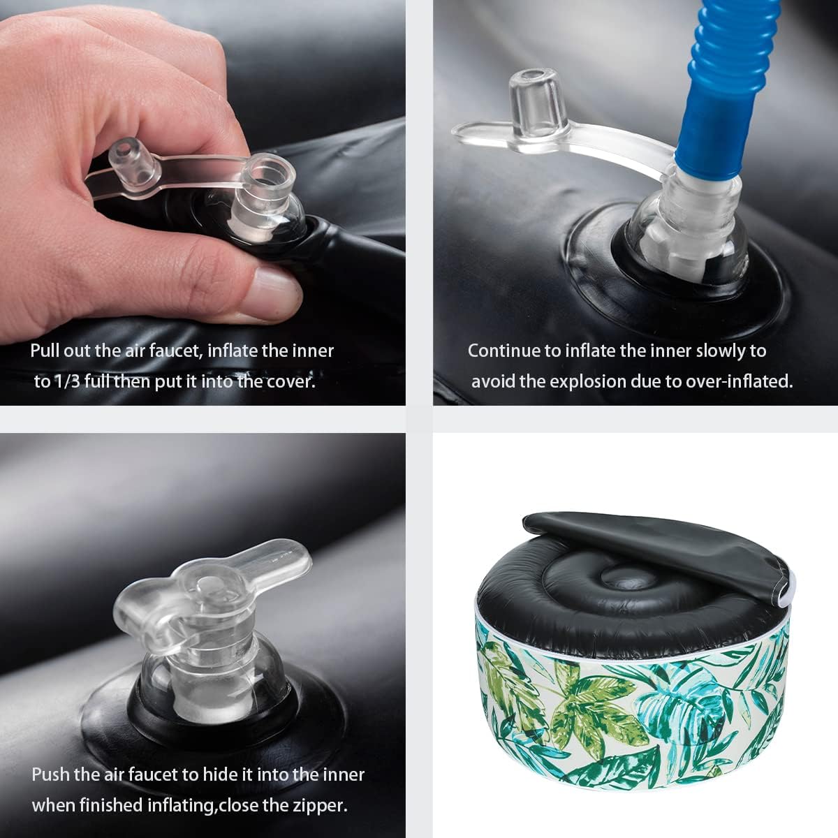 - 【Package Included】-You will received a flat hand-held storage bag inlclude 1pc black inflatable ottoman pouf inner measures D20"xH9", 1pc floral ottoman cover with fully zipper closure and wide portable handle for free movement, and 1pc air pump. They are easy assembling. :)