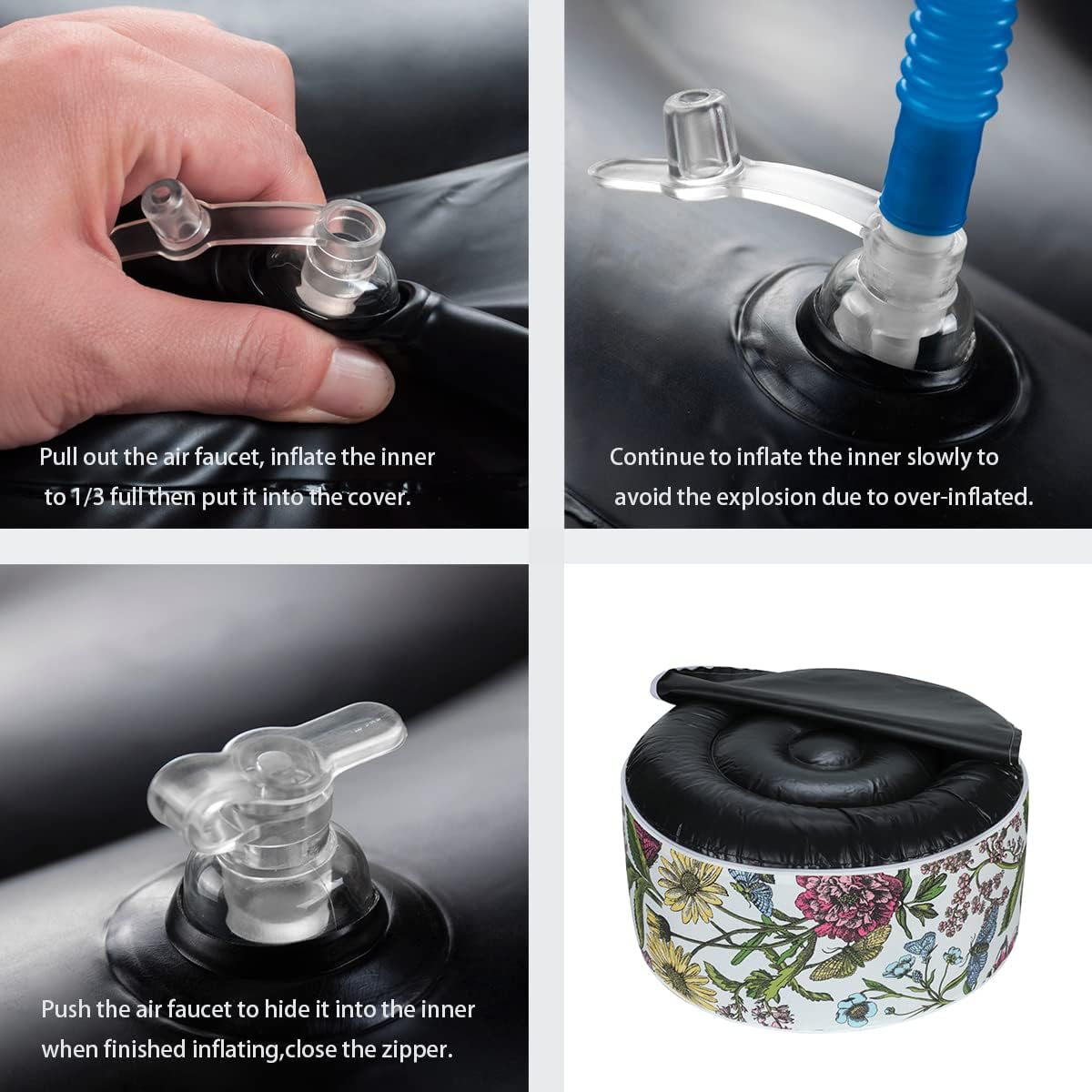 - 【Package Included】-You will received a flat hand-held storage bag inlclude 1pc black inflatable ottoman pouf inner measures D20"xH9", 1pc floral ottoman cover with fully zipper closure and wide portable handle for free movement, and 1pc air pump. They are easy assembling. :)