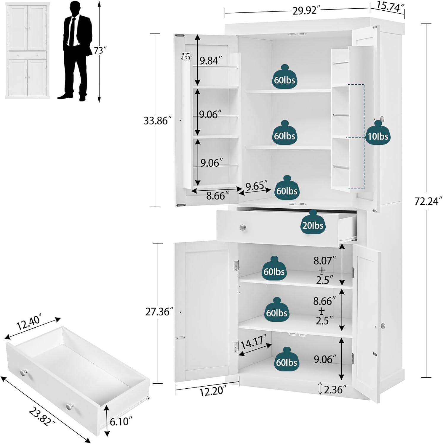 - 【Master Organizer]】This 72" tall pantry storage cabinet comes with 1 large center drawer, 2 large double-door storage cabinets, and 1 adjustable shelf which can meet different heights of storage needs, suitable for everything from your food and utensils to your kitchen appliances. In addition, the upper door cabinet also has 6 hanging shelves for storing your olive oil, spices and other kitchen items easy to find and access