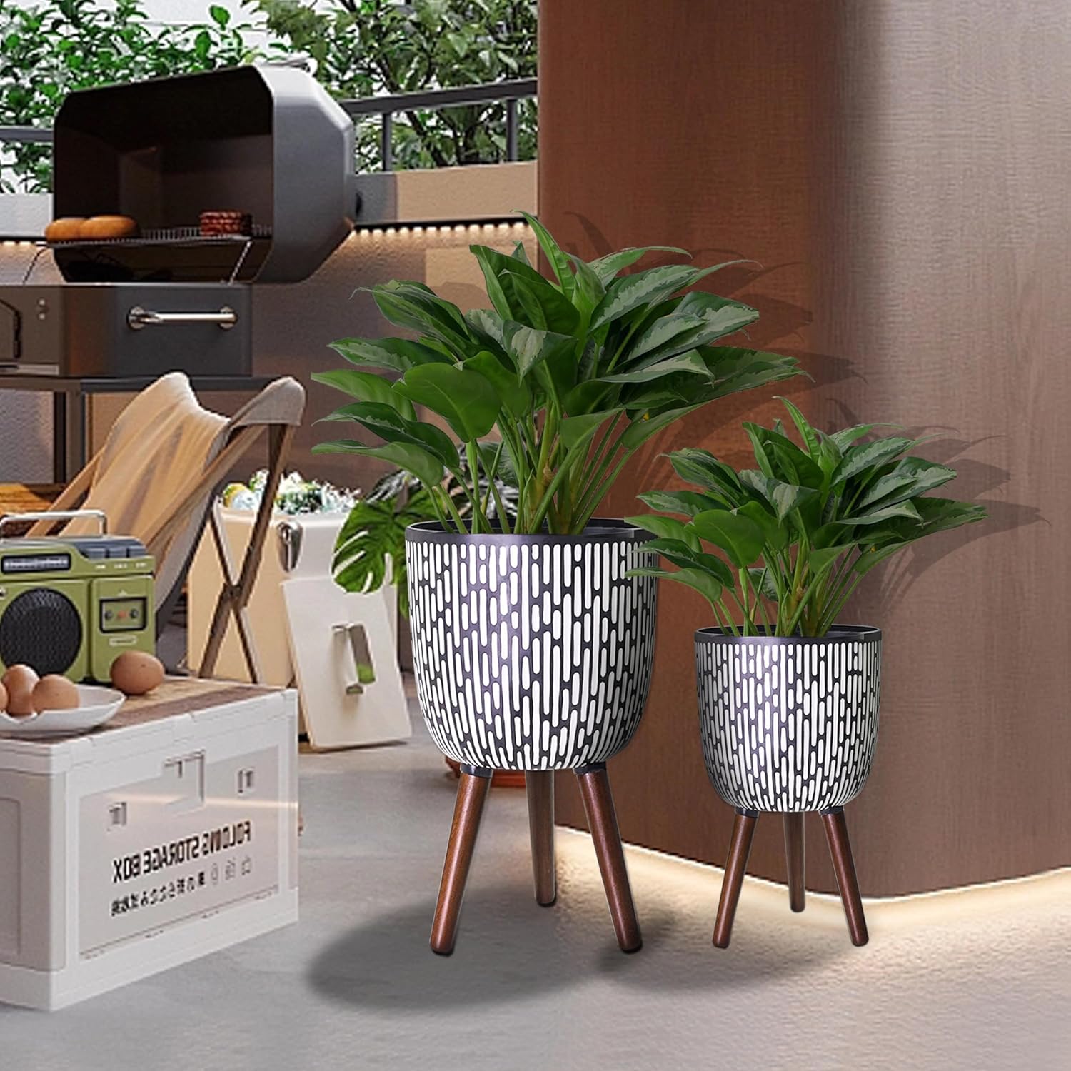 2 Set Plant Pot with Stand 10 & 12 inches, Mid-Century Large Planter with Legs for Indoor Plants, Boho Print Standing Plant Pot with Drainage Plug for Monstera, Herb, Succulent Flower Pot