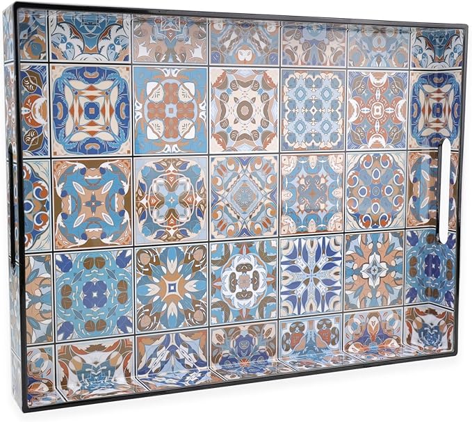 Spsyrine Serving Tray with Handles, Plastic Decorative Tray for Coffee Table, Living Room, Home Decor,Boho