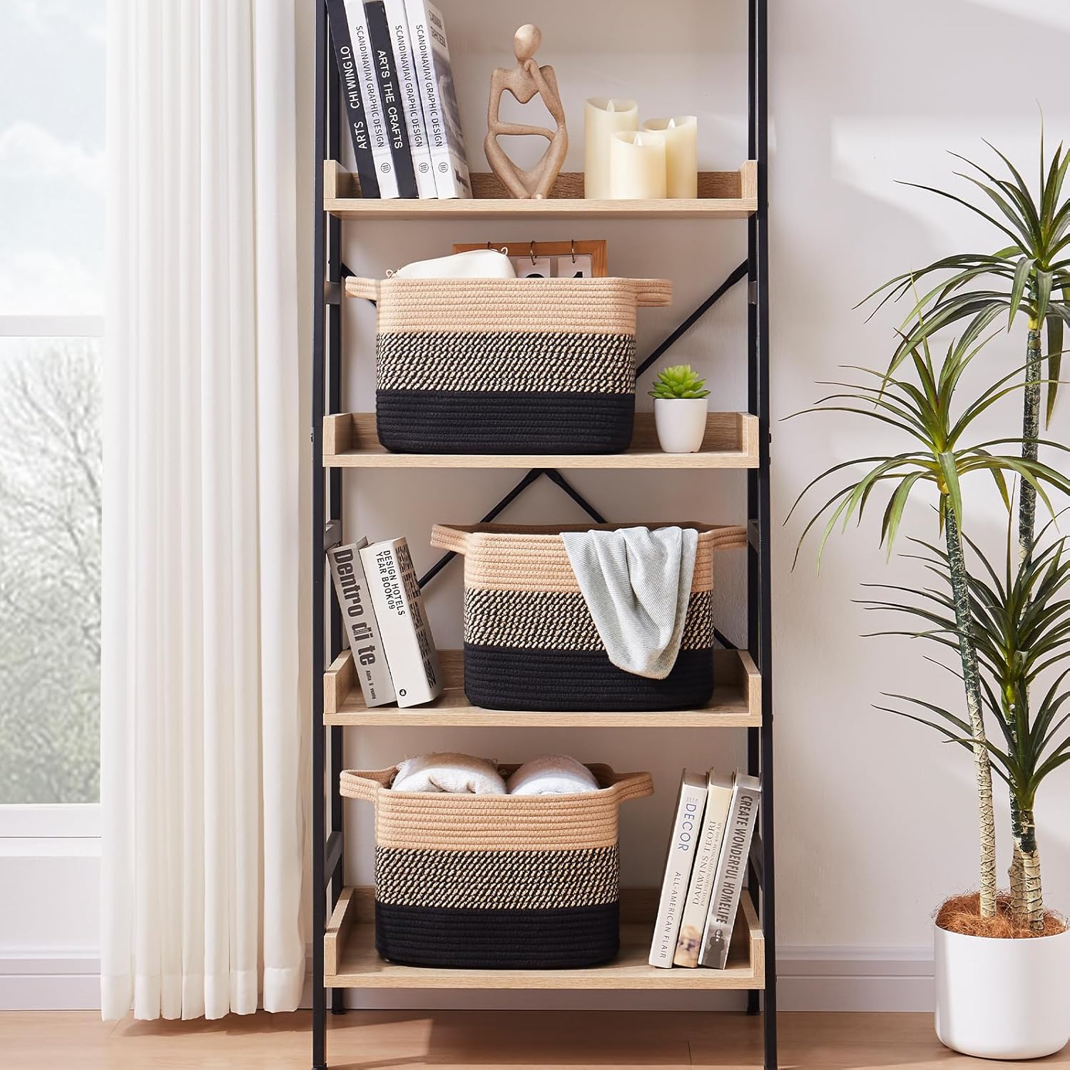 OIAHOMY Storage Basket, Woven Baskets for Storage, Cotton Rope Basket for toys,Towel Baskets for Bathroom - Pack of 3, Black & Brown