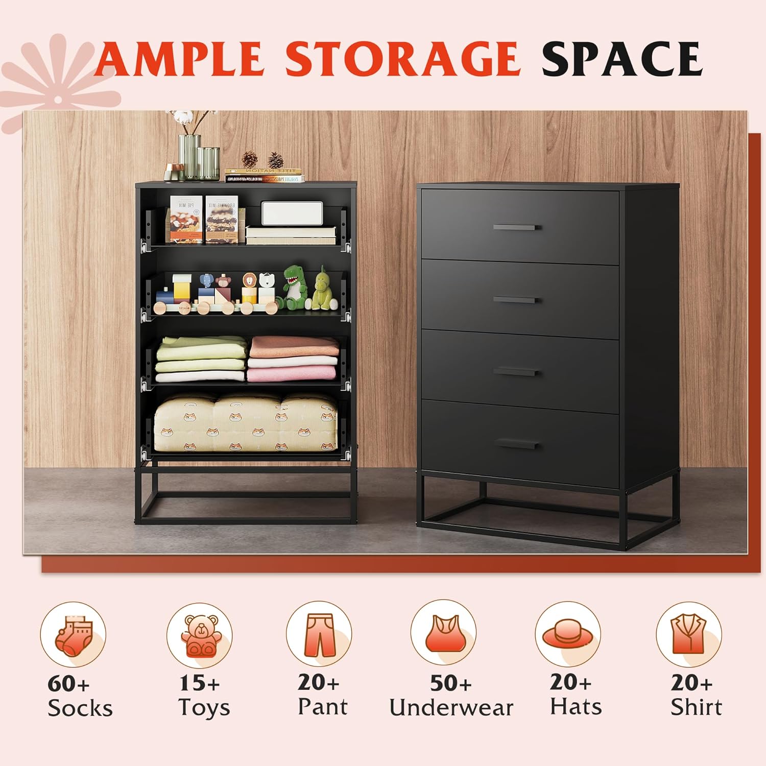 WLIVE Black Dresser for Bedroom with 4 Drawers, Tall Wood Dresser with Sturdy Metal Frame, Wooden Chest of Drawers for Hallway, Living Room, Closet