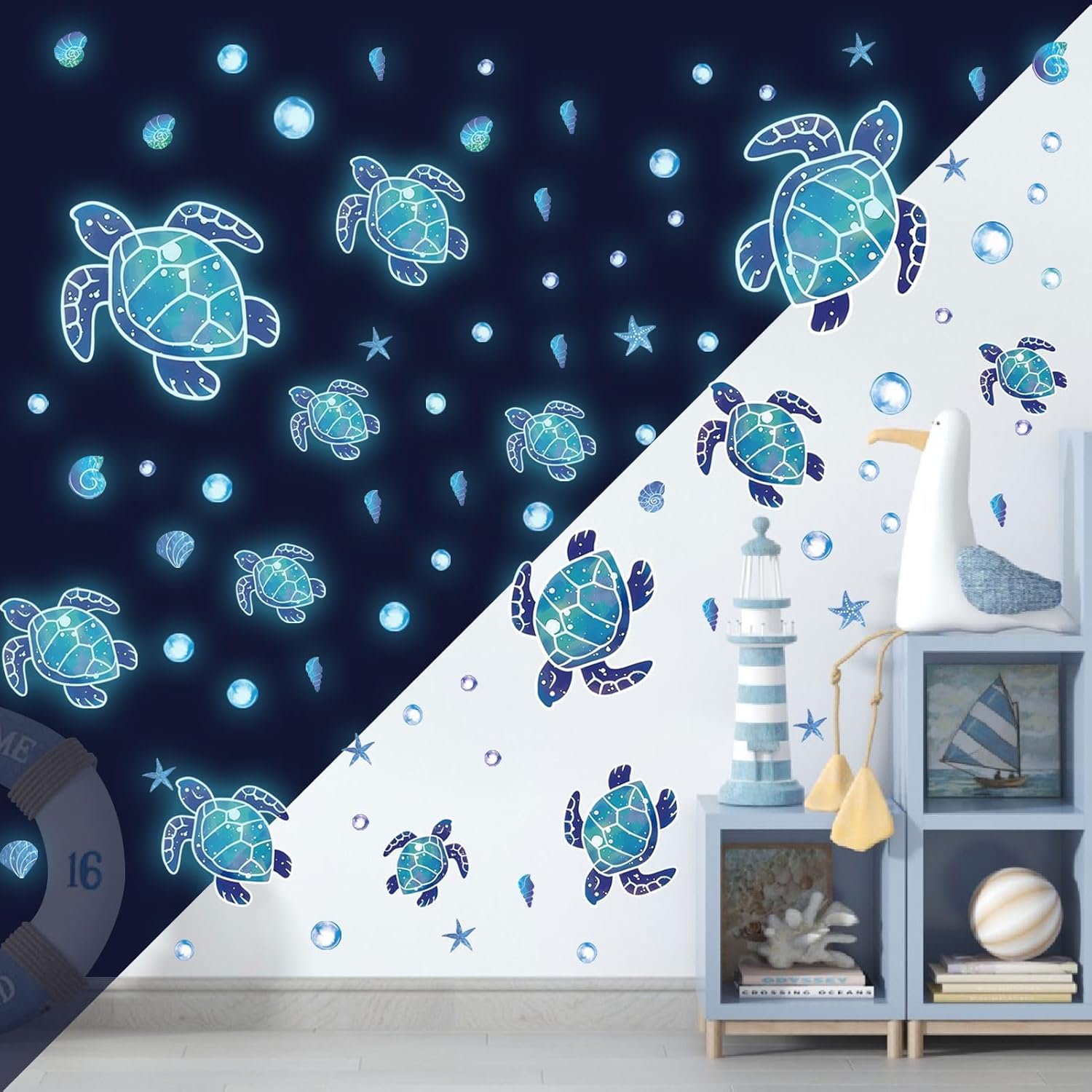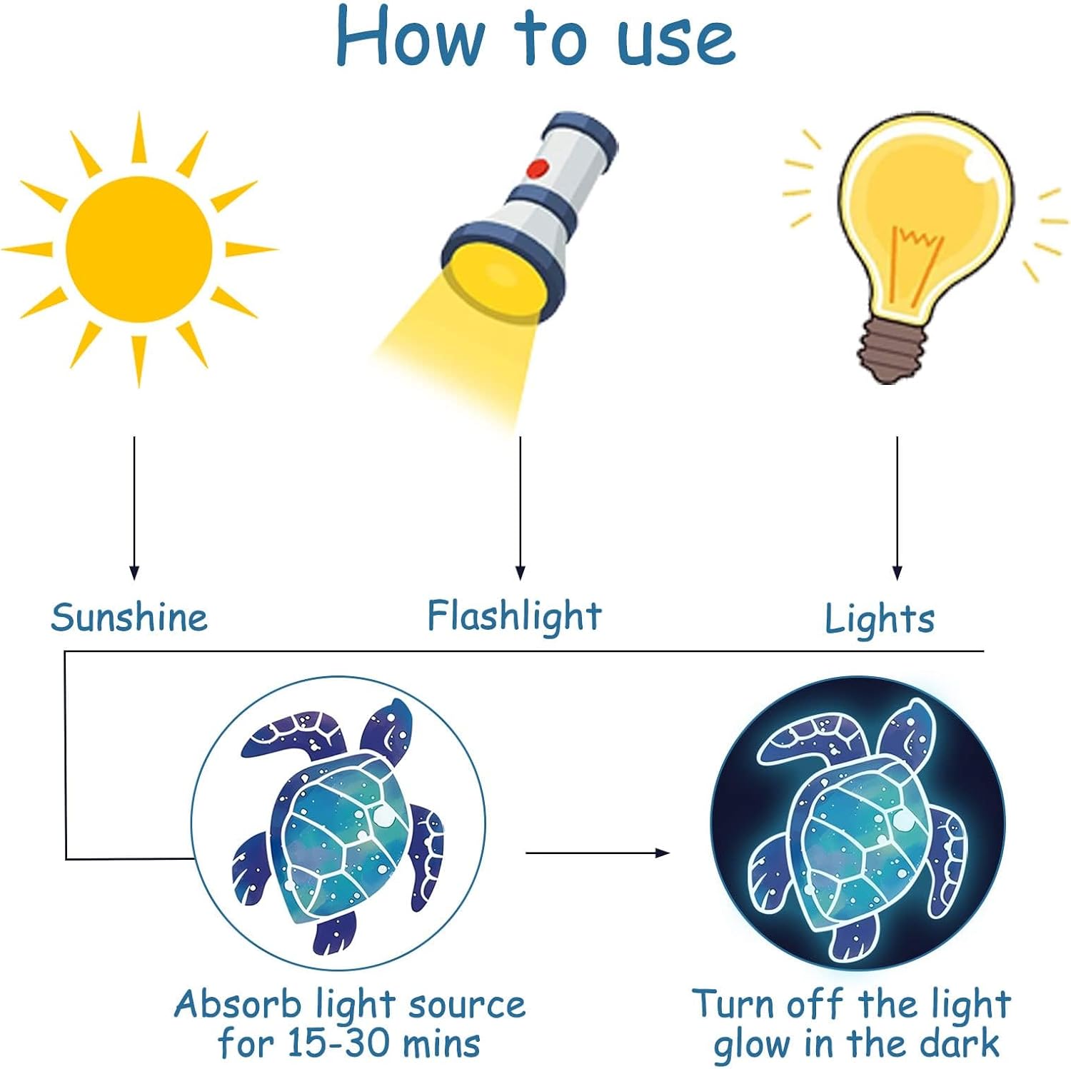 - WIDE APPLICATION:These glow in the dark sea turtle decor is securely to the bathroom, bedroom without glue or tape.Also can be suitable for lockers,ceilings,TV background, refrigerators, or any other smooth, clean surfaces.