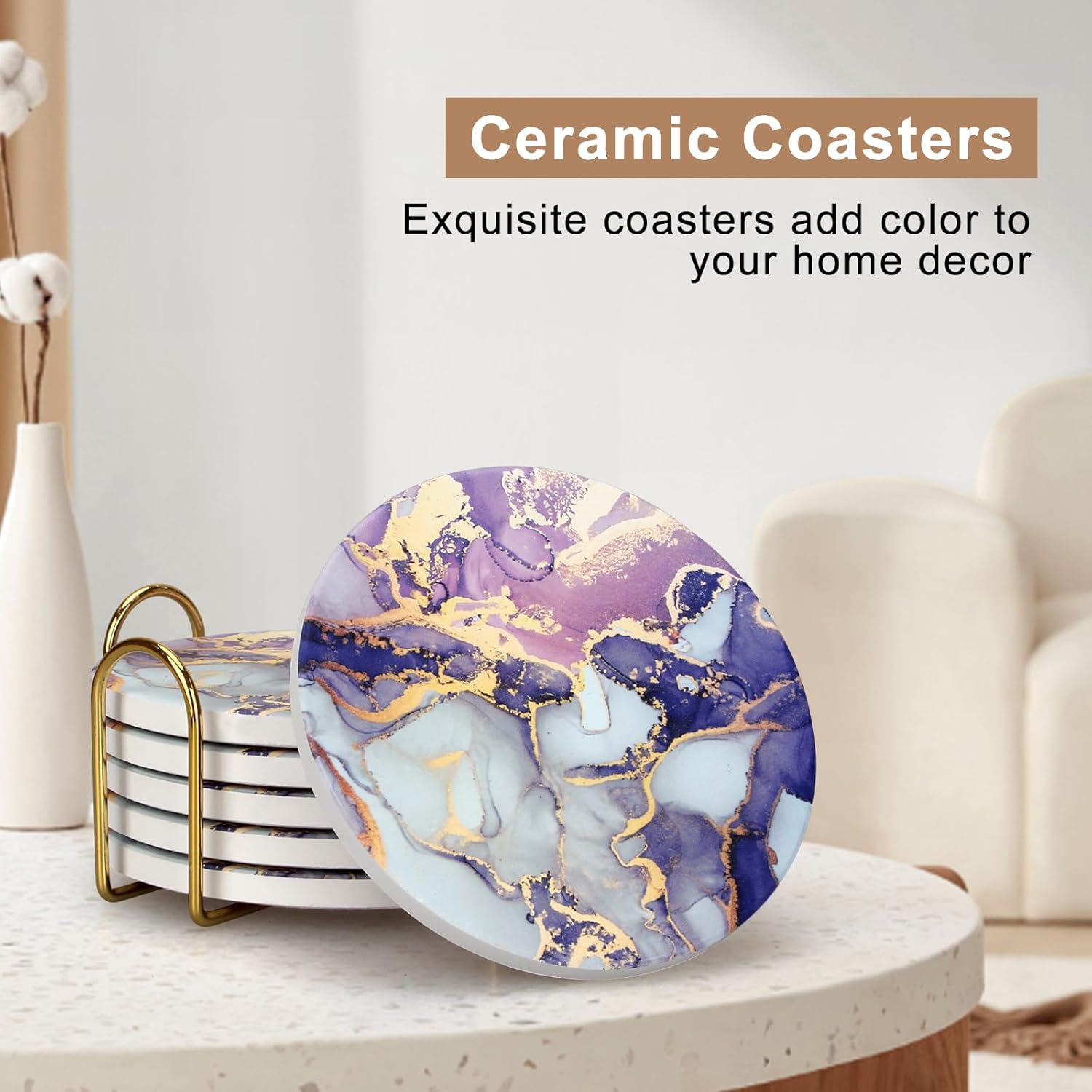 - COASTER SET WITH HOLDER: This drink marble coaster set comes with 6 ceramic stone coasters. Plus, the gold iron coaster holder keeps your coasters organized and saves space.