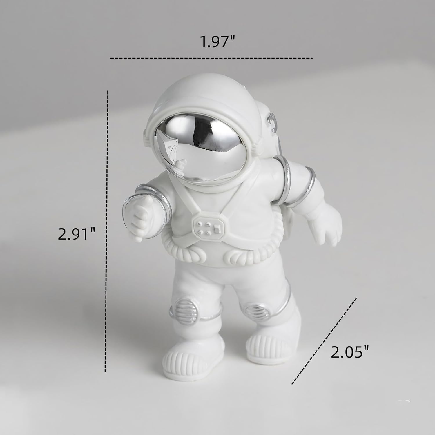 - Decent Size - seating moon astronaut statue L 1.97 "(5 cm) x W 1.57" (4 cm) x H 3.11 "(7.9 cm), walking astronaut statue L 1.97 "(5 cm) x W 2.04" (5.2 cm) x H 2.9 "(7.4 cm), waving hand astronaut statue L 2.6 "(6.5 cm) x W 2.2" (5.5 cm) x H 4 "(10 cm).