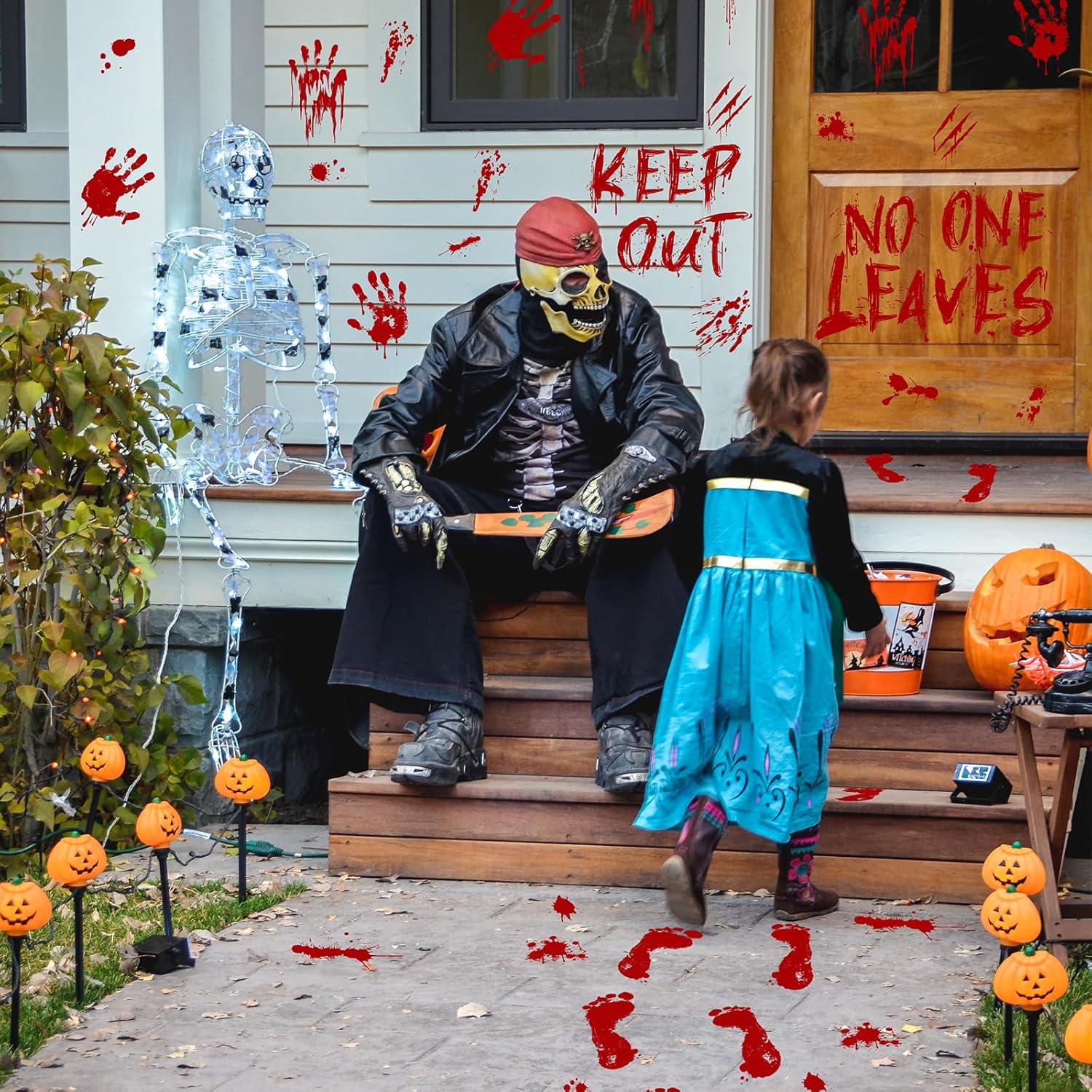 - Realistic Bloody Footprint Design - The Halloween Bloody Footprint Sticker Set offers a spine-chilling collection of 7 bloody footprint stickers and 3 bloodied handprint stickers. It also includes a "NO ONE LEAVES" sticker and a "KEEP OUT" sticker. The natural shape and bright red color create a realistic feeling! Scare your guests with this Halloween Bloody Decoration! Create a creepy atmosphere and they will feel scared!