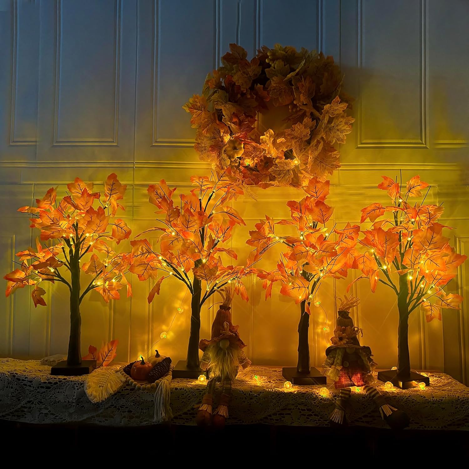 - 🍁【Light Up Maple Tree Lights】 4pack lighted fall decor tree ,Each maple leaf tree 24" overall height, 4" x 4" base, 24 warm white LED light up maple trees, powered by 3 AA batteries (not included) and USB power, perfect for desktop decorate.Fall Decorations for Home-This lighted fall tree is a wonderful and unique item that can brighten up any home.
