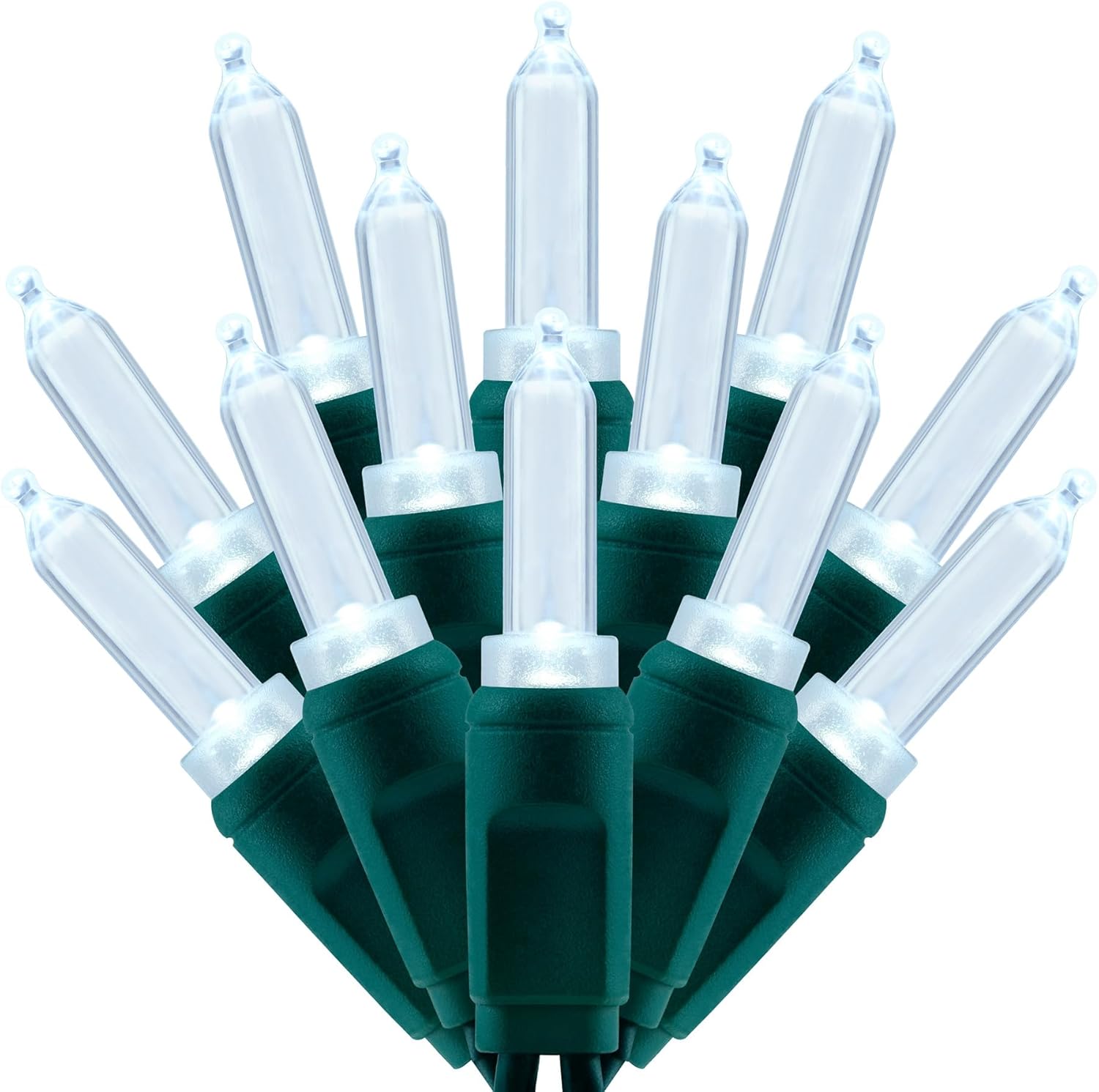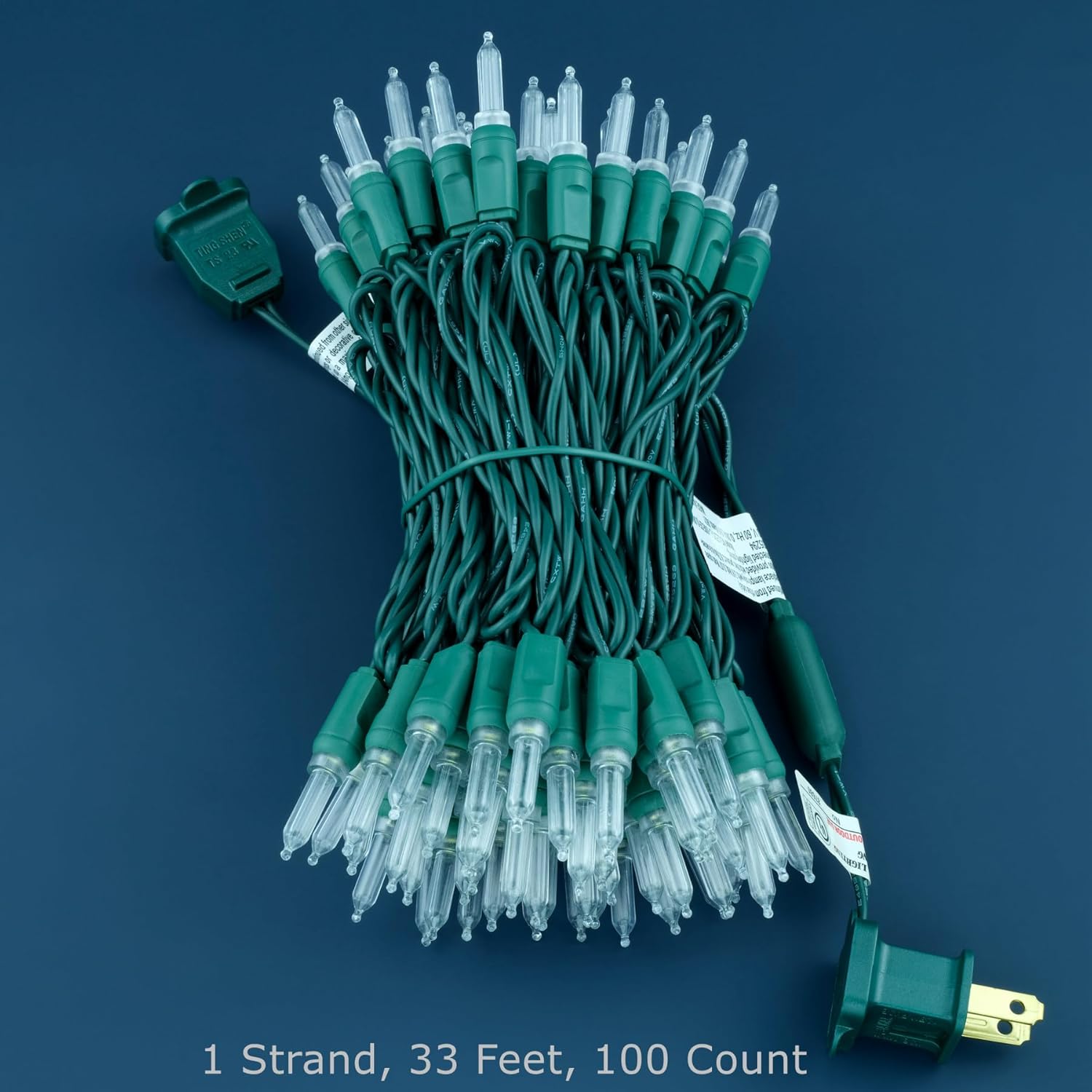 - SPECIFICATIONS β Each pack contains 1 strands of one-piece string lights, total length 33 feet with 100 count cool white mini lights. 22 AWG green cord, 4" lead, 4" spacing, 4" tail.