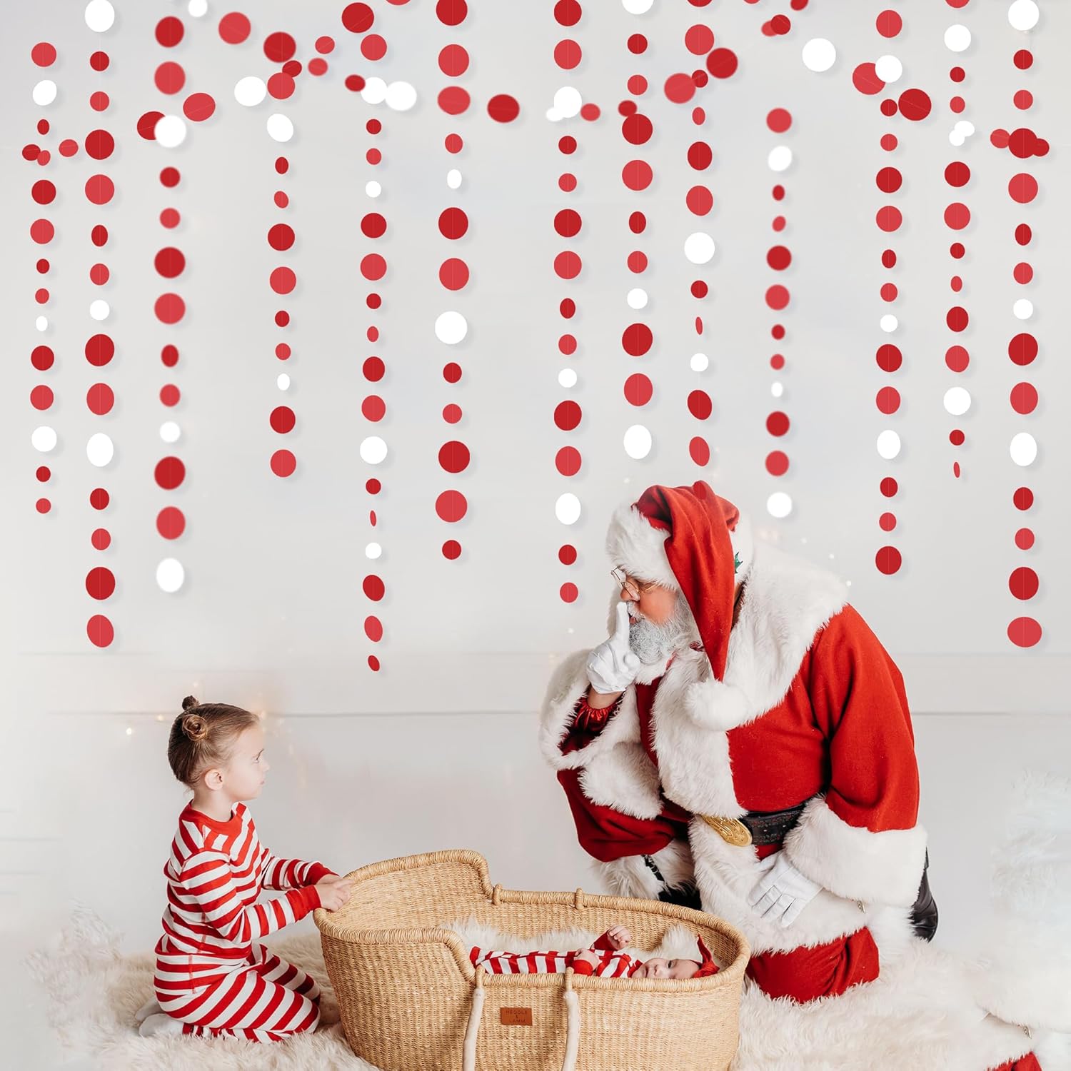 - 🔴PACKAGE CONTAINS- 4 set of red and white circle dot party garland banner,Each string is 11.5 feet/3.5 meters, Total is 14 meters/46 feet.