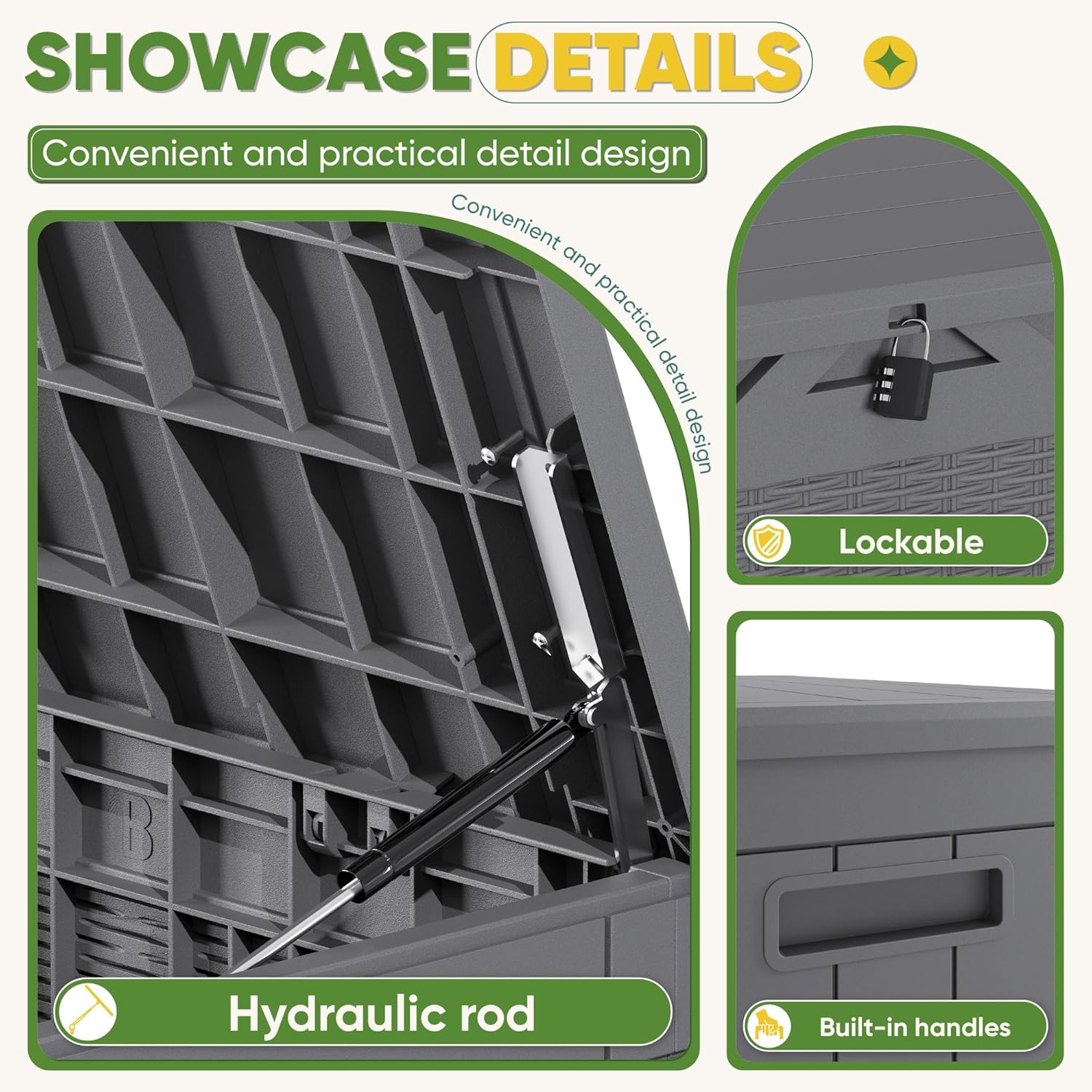 - LARGE STORAGE SPACE: The deck box has 100 gallons of storage space, which can perfectly place your garden tools, pool gear and etc, make sure your space looks clean and tidy.