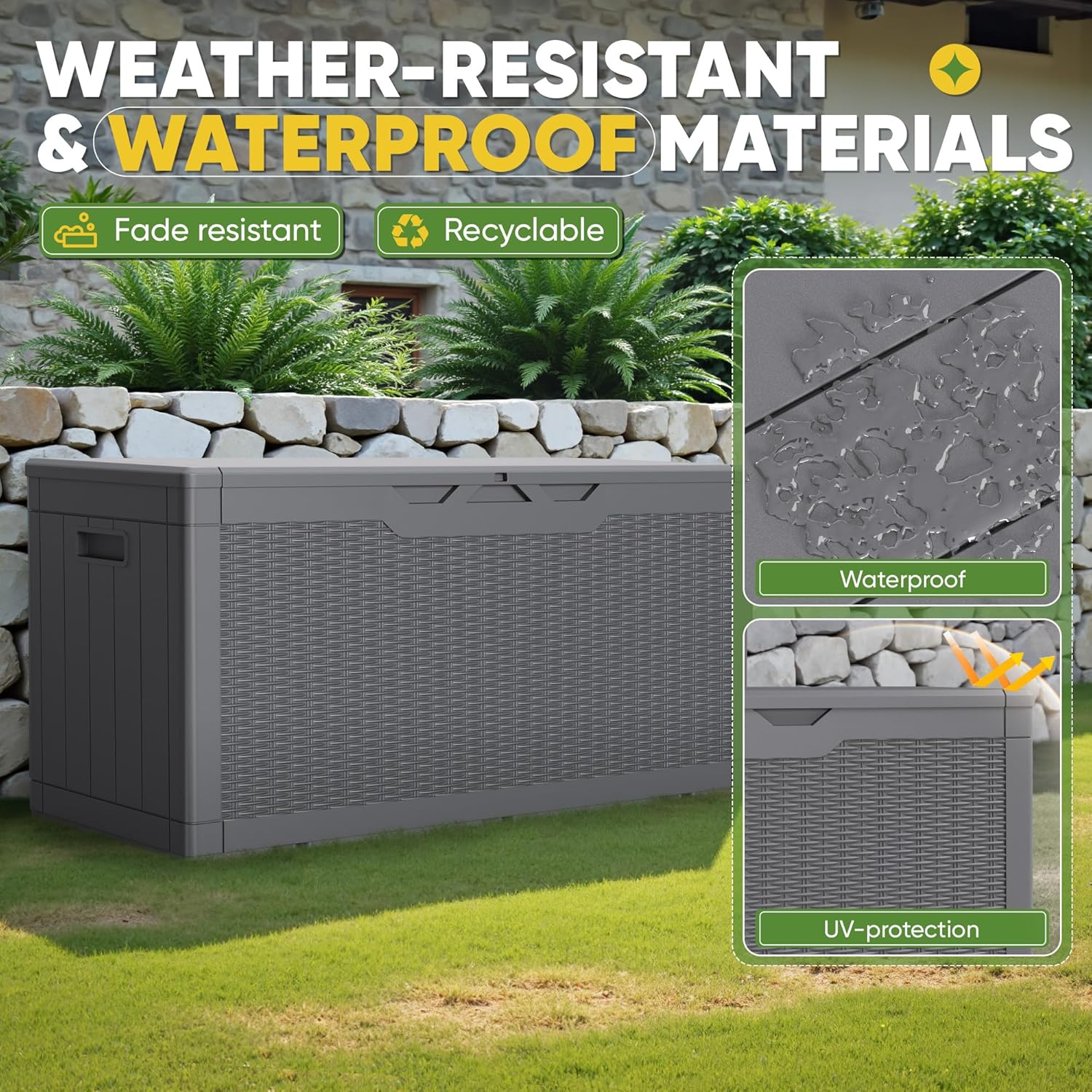 - WIDE VERSATILITY: The 100 gallon storage box can not only help you organize your patio or lawn. It can also be used as a table or bench when you need it, and the lid is equipped with a support bar inside, which can greatly enhance the stability and weight-bearing capacity of the storage box.
