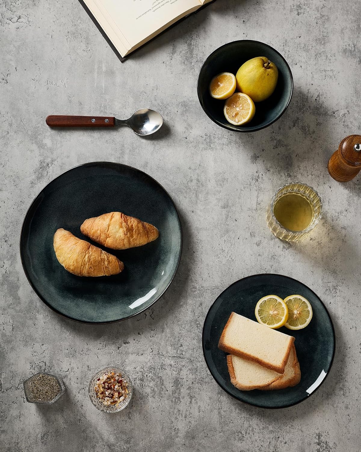 Famiware Dinnerware Sets for 4, Ocean Round 12-Piece Kitchen Plates and Bowls Sets, Reactive Glaze, Microwave and Dishwasher Safe, Scratch Resistant, Deep Forest