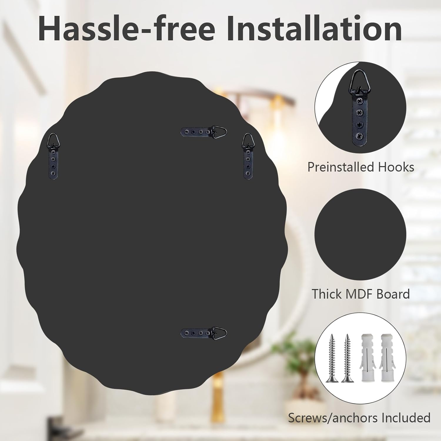 - 【Easy Installation】All mounting hardware are included. The thick MDF backboard is sturdy enough to support the weight of this oval bathroom mirror, with 4 pre-installed hooks on it, you can easily complete the installation within minutes. Support for both horizontal and vertical hanging.