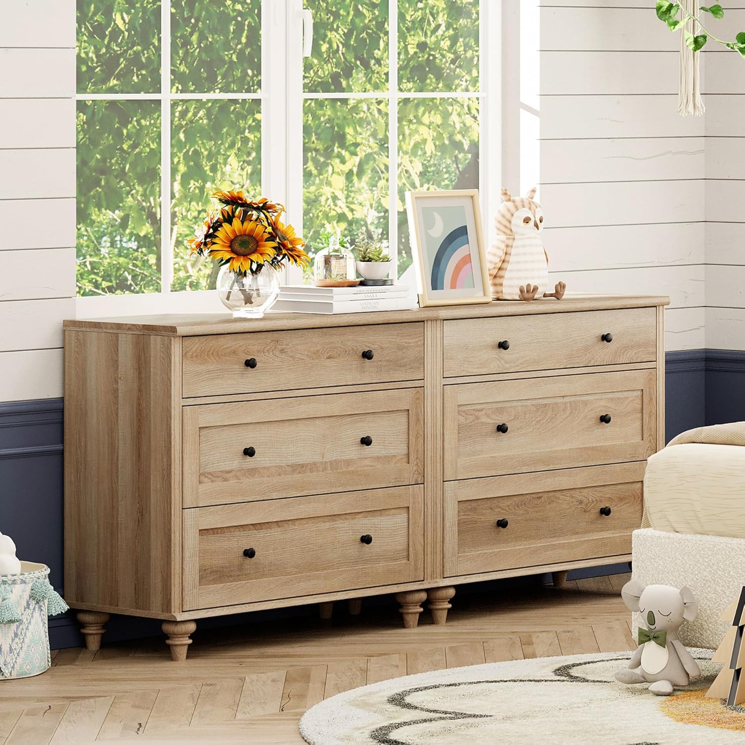 WAMPAT Kids Dresser for Bedroom with 6 Drawers, Oak Baby Dressers with Wide Chest of Drawers, Mid Century Modern Wooden Closet Storage Organizer, Large Wood Dressers for Living Room, Nursery, Hallway