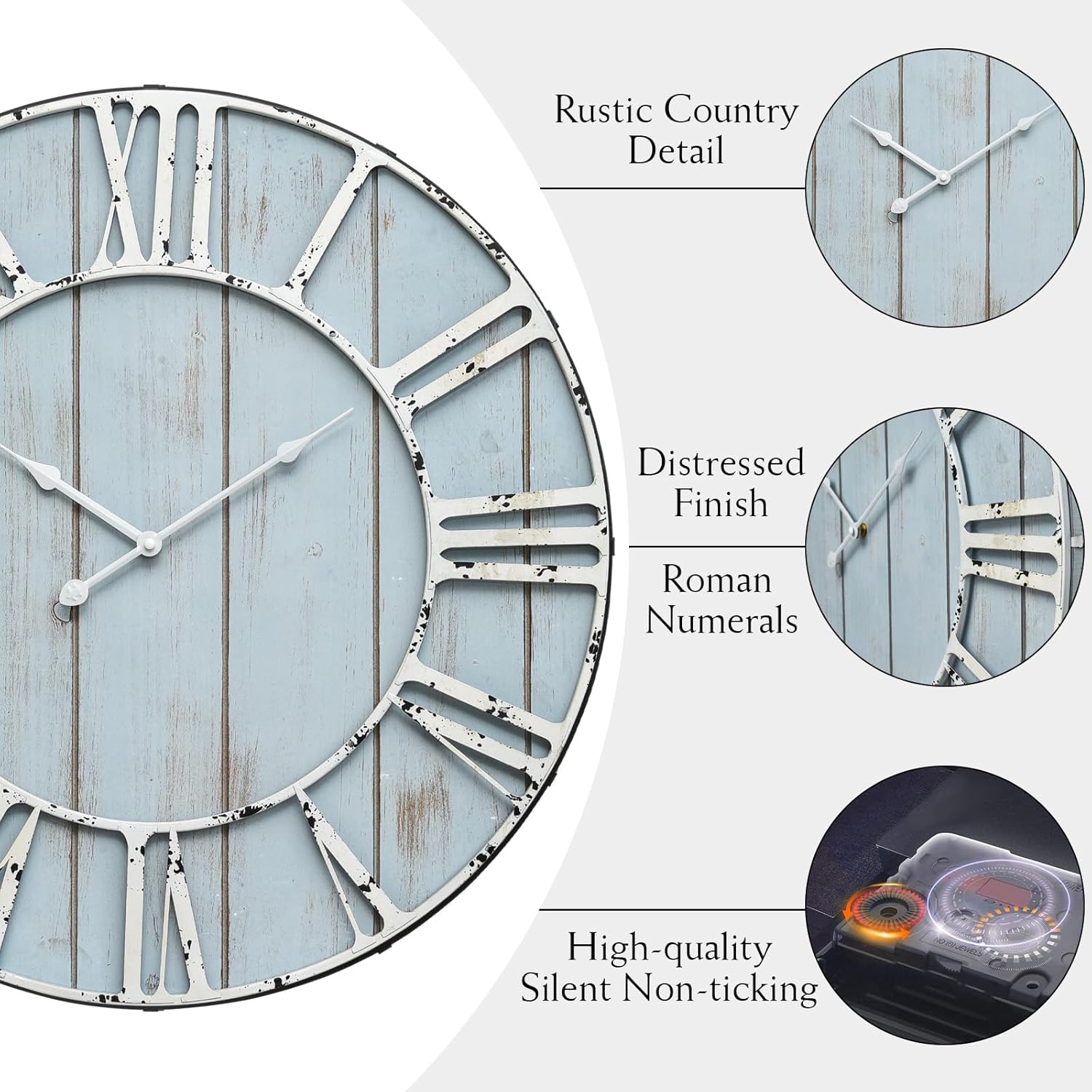 Large Farmhouse Wall Clock 24 Inch Vintage Blue Wooden Wall Clock with Quiet Ticking and Minimalist Roman Numerals for Bedroom Living Room Office Kitchen Home Decor, Battery Operated