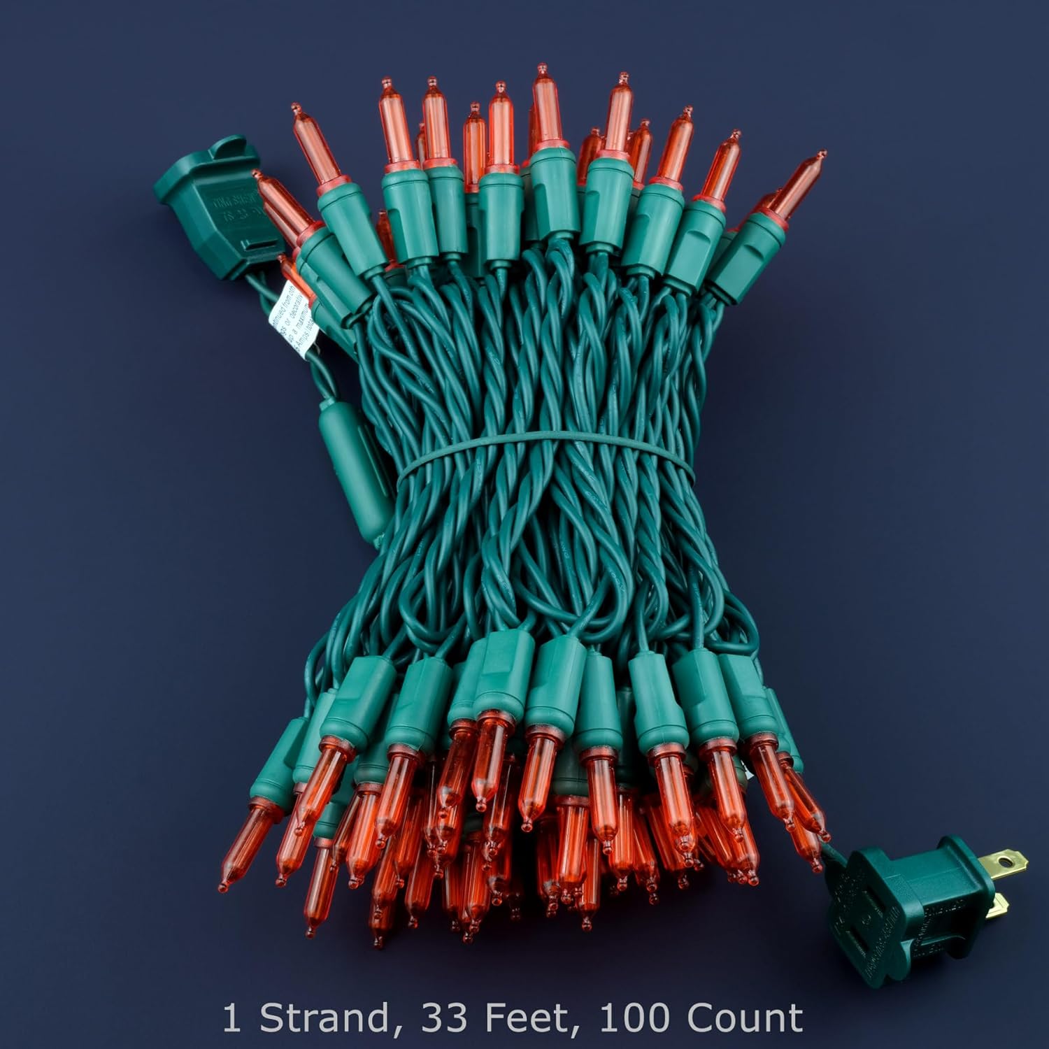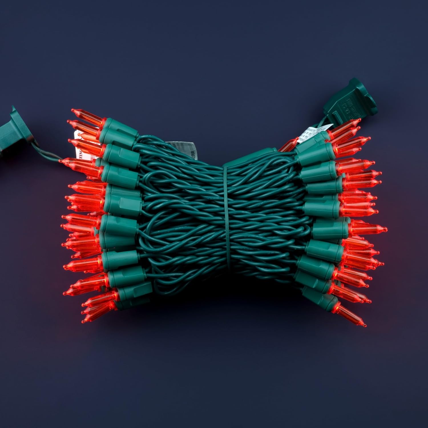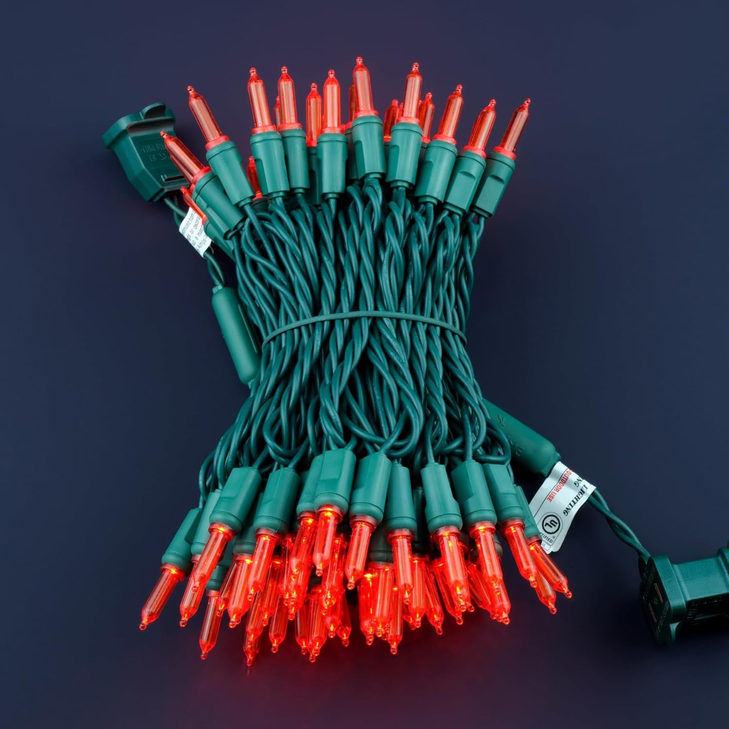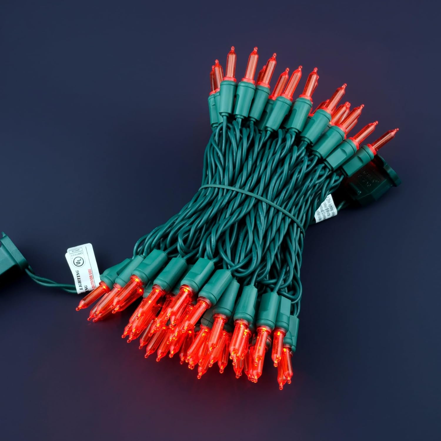 - SPECIFICATIONS β Each pack contains 1 strands of one-piece string lights, total length 33 feet with 100 count red mini lights. 22 AWG green cord, 4" lead, 4" spacing, 4" tail.