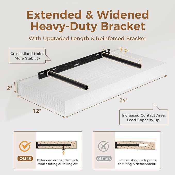 - 【FARMHOUSE RUSTIC WALL SHELF】These floating shelves are made of premium engineered wood board and invisible one-piece bracket. The rustic wooden grain surface add character and warmth to any modern or traditional interior with these thick floating shelves, contrast shelves at staggering heights on the wall or mount side-by-side or in the corner for a clean streamlined look.