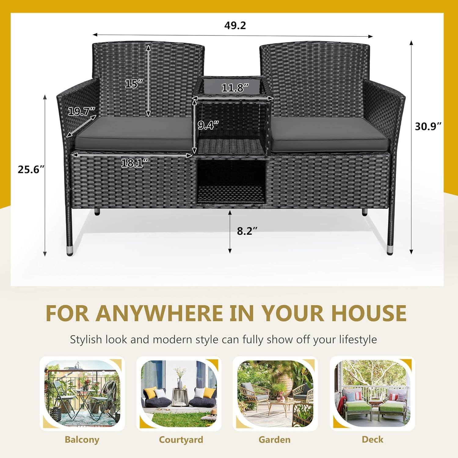 Flamaker Outdoor Furniture Patio Loveseat Wicker 2-Seat with Built-in Table and Cushions Rattan Porch Chairs Bench for Balcony, Lawn, Backyard (Grey)