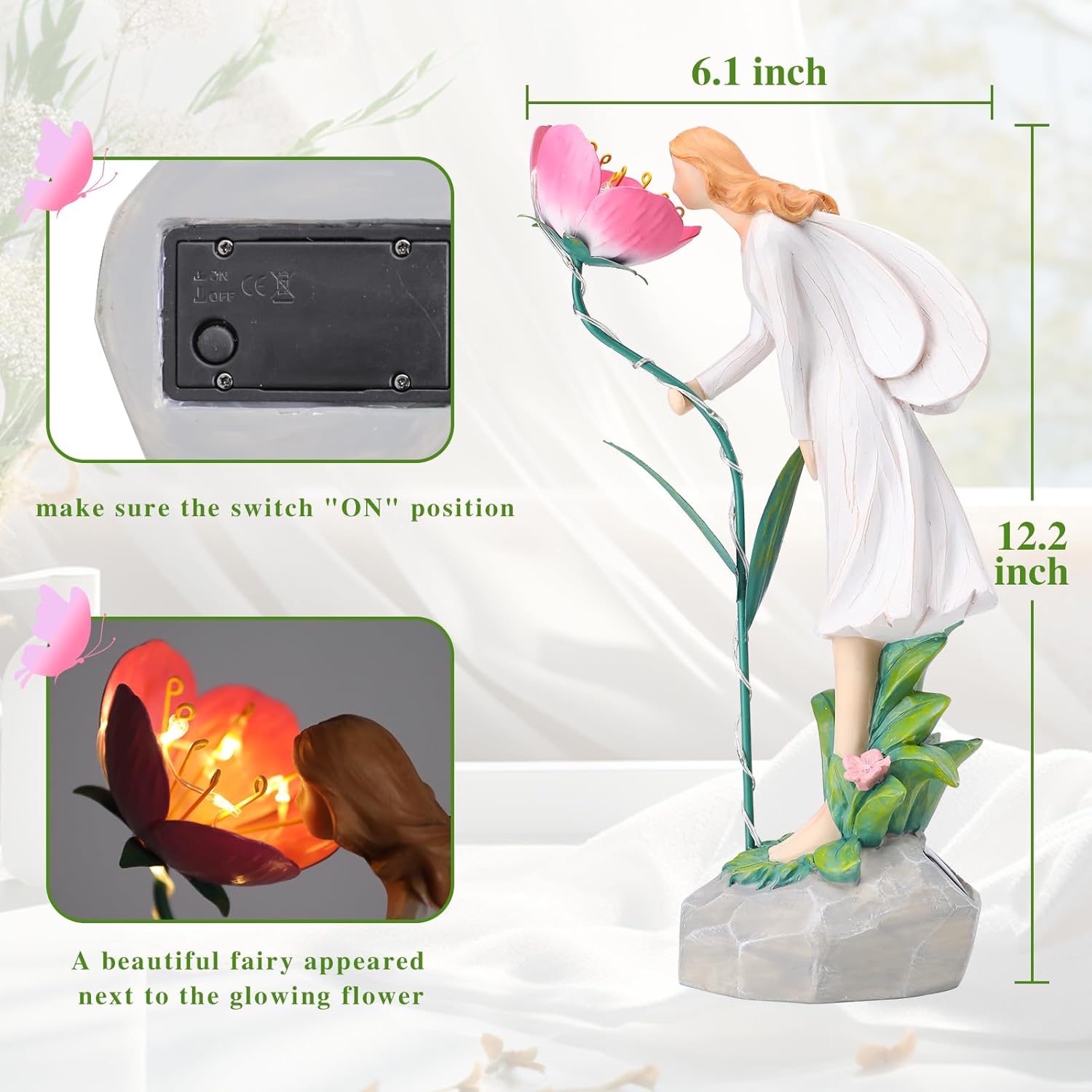 - 【Fairy Garden Decorations】Elegant fairy standing on the stone gets closer to this beautiful pink flower and presents a warm and peaceful scene in yard. the pink flower will turn on at night to glow warm light for your yard.