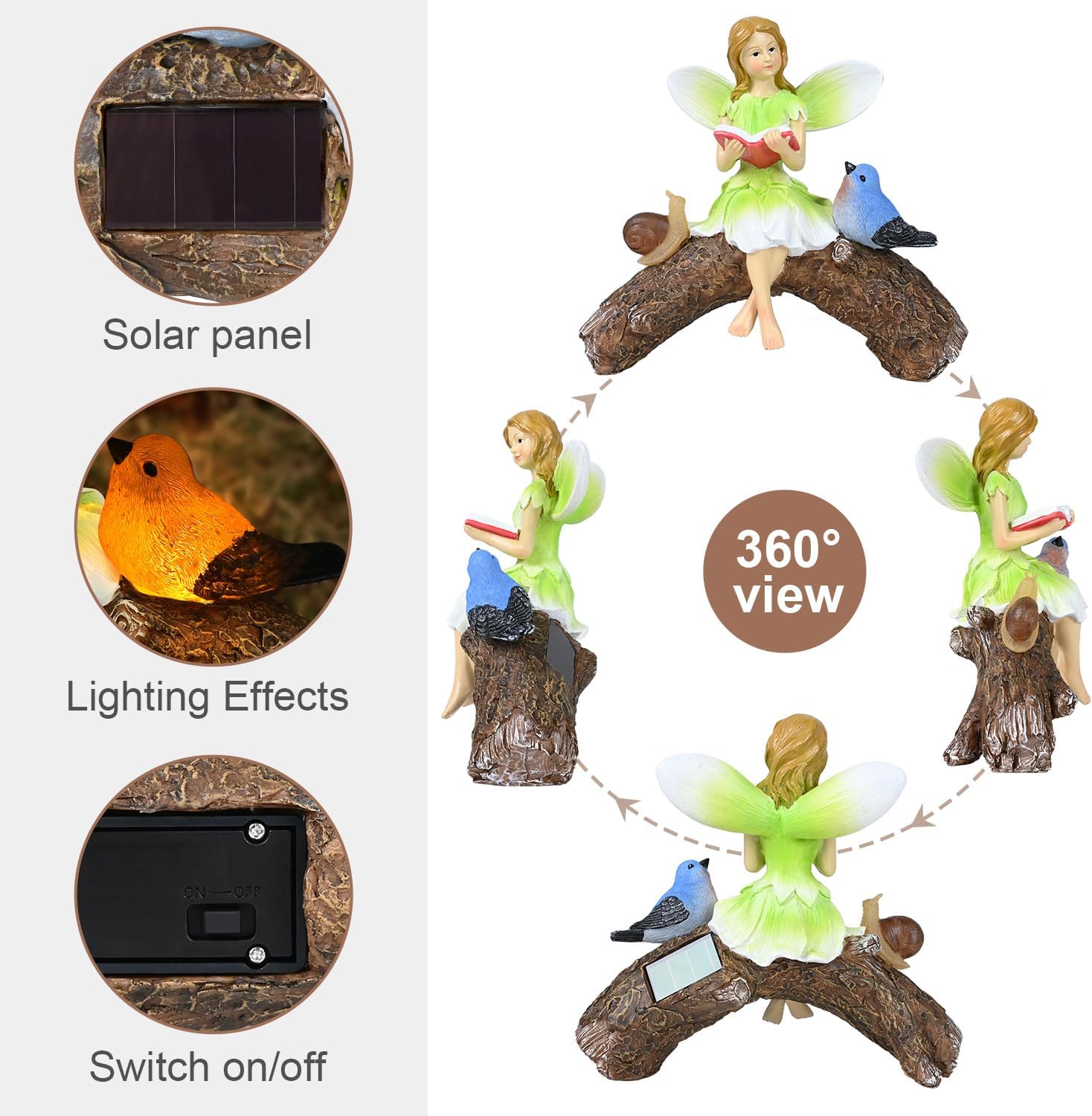 - 【AUTO-ON SOLAR DECORATION】This solar flower fairy figurine is very easy to install and use. Simply turn on the switch and place it under the sunlight and let the solar panel will charge within 5-8 hours during the day and light up automatically at night for 8-10 hours.bird and snails figurine glow at night