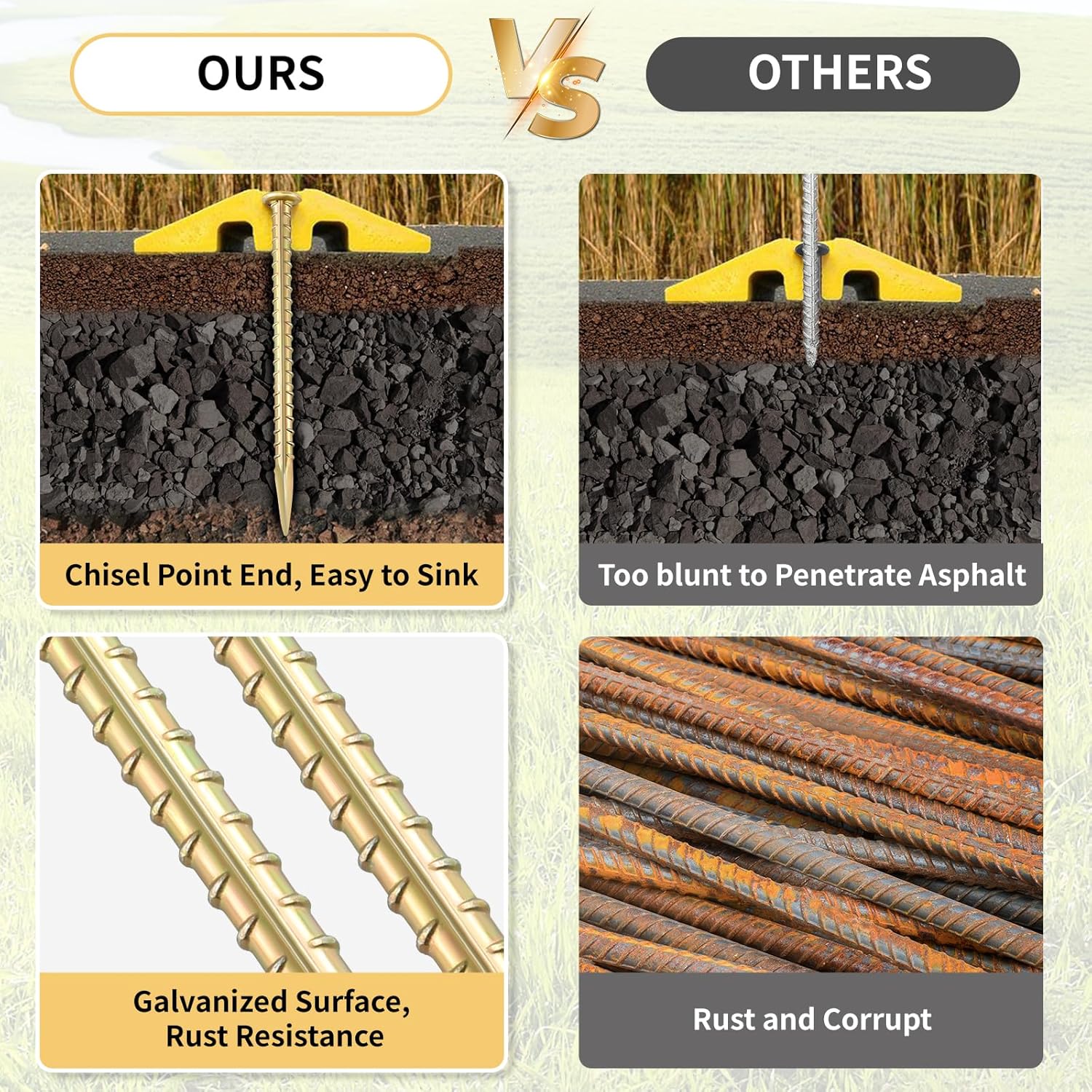 - 【Chisel Point End】Sharp pointed end made it easy to pound into hard ground and get through the gravel base. Yellow paint help it last for years and withstand any weather and ground.
