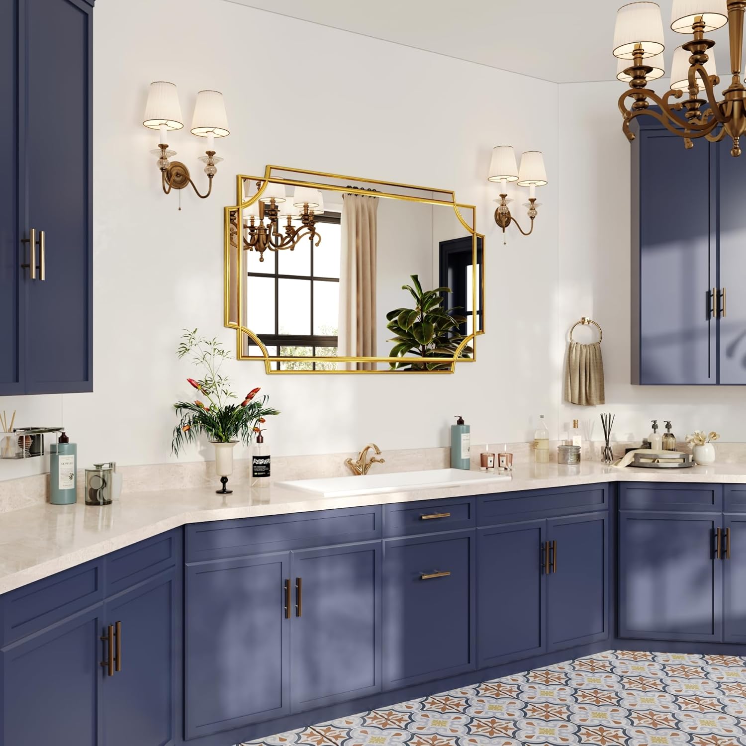 Kelly Miller Large Gold Mirror for Wall, 30"x46" Gold Bathroom Mirror Vanity Mirror Decorative Mirror Scalloped Beveled Mirror for Master Bath Half Bath Living Room Bedroom Farmhouse Fireplace Hallway