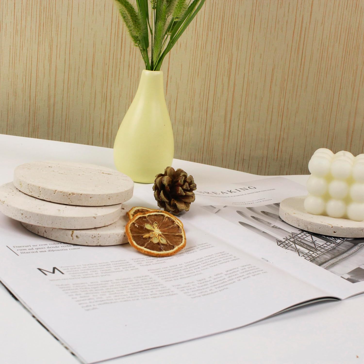 Marble Coasters – Set of 4 –Beige Travertine Bar Coasters for Drinks, Coffee –Stone Holder for Home Décor, Housewarming Gifts (Round)
